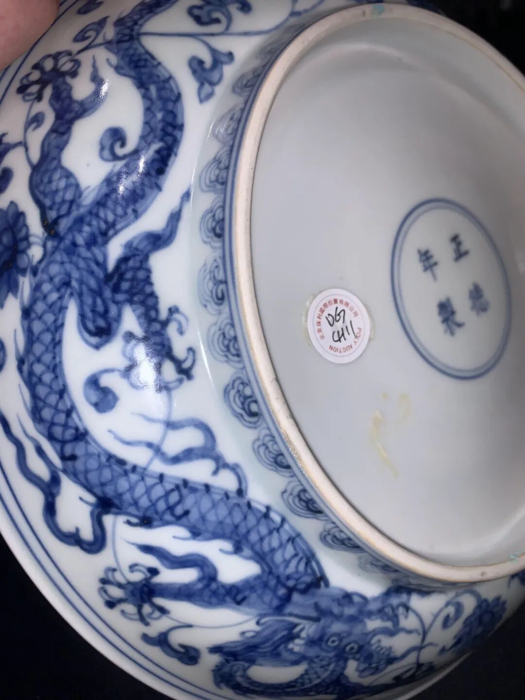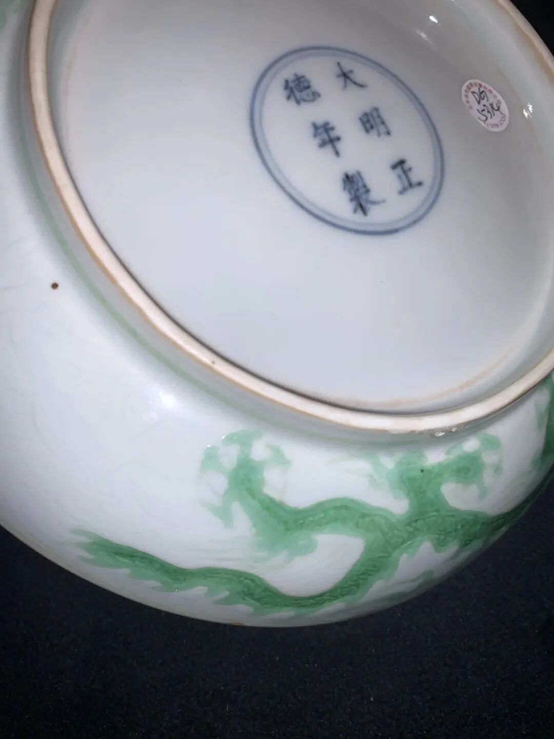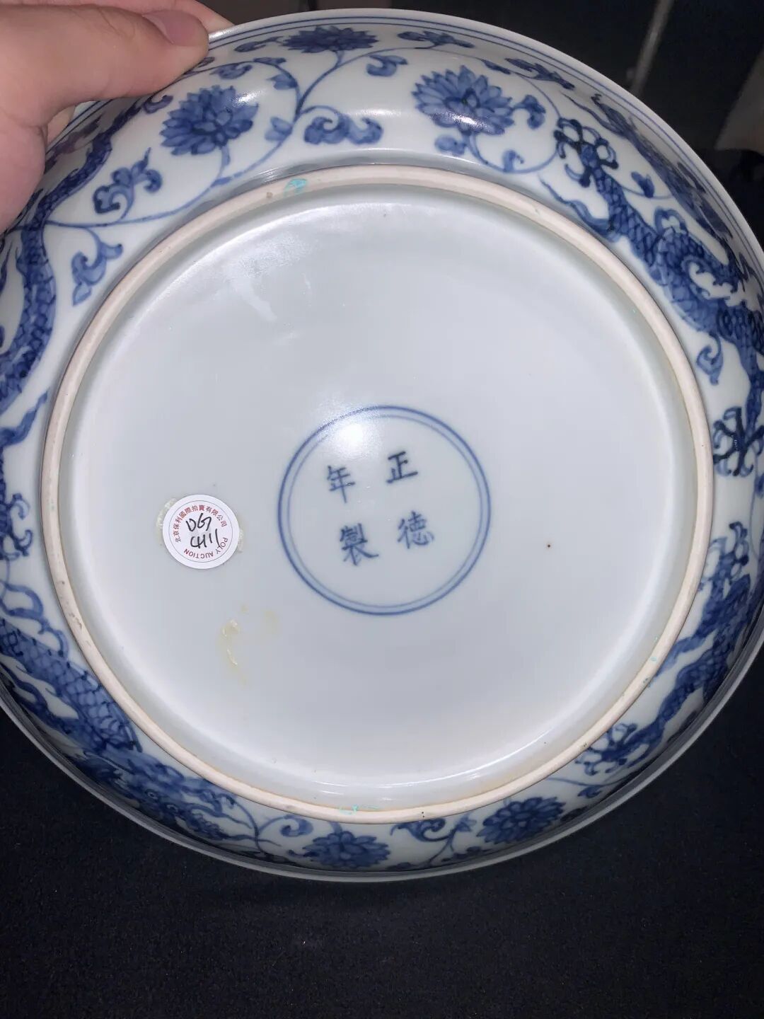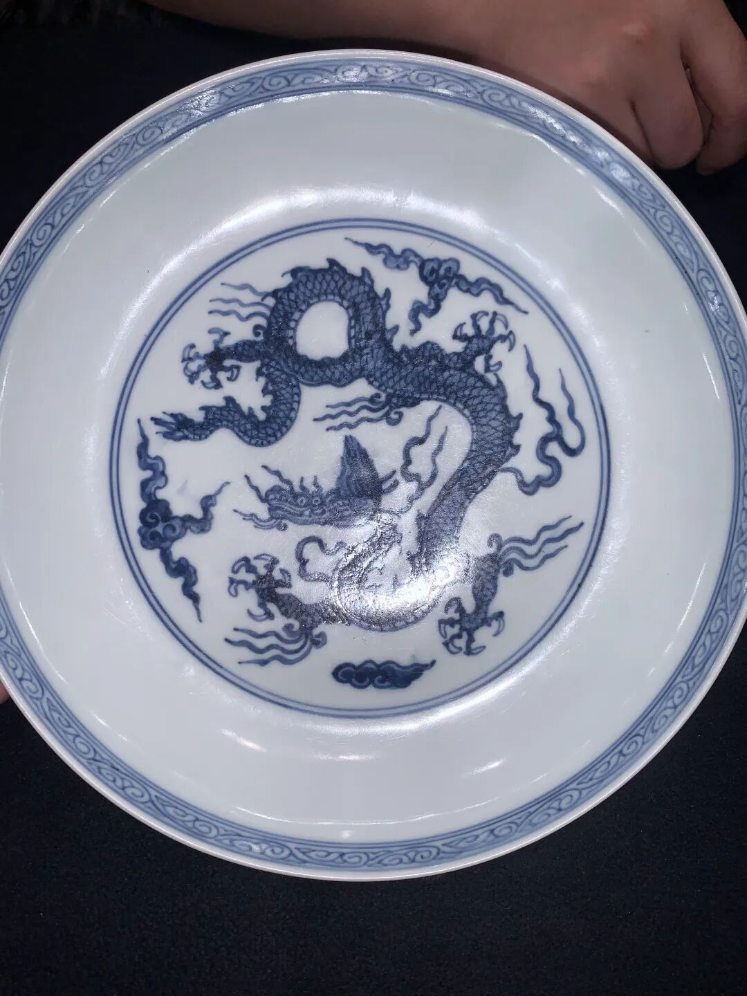 明宣德 霁青釉暗刻朵云行龙纹盘