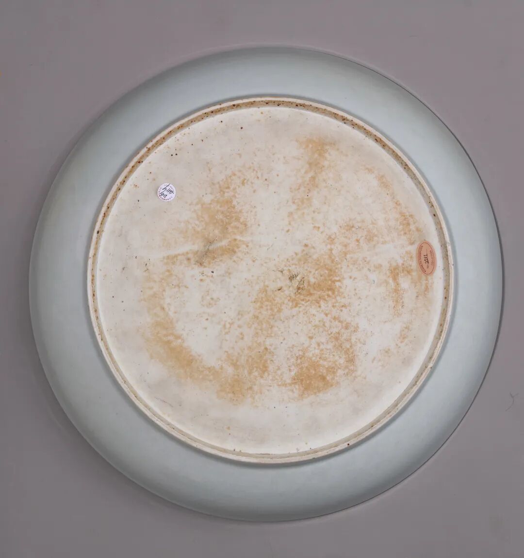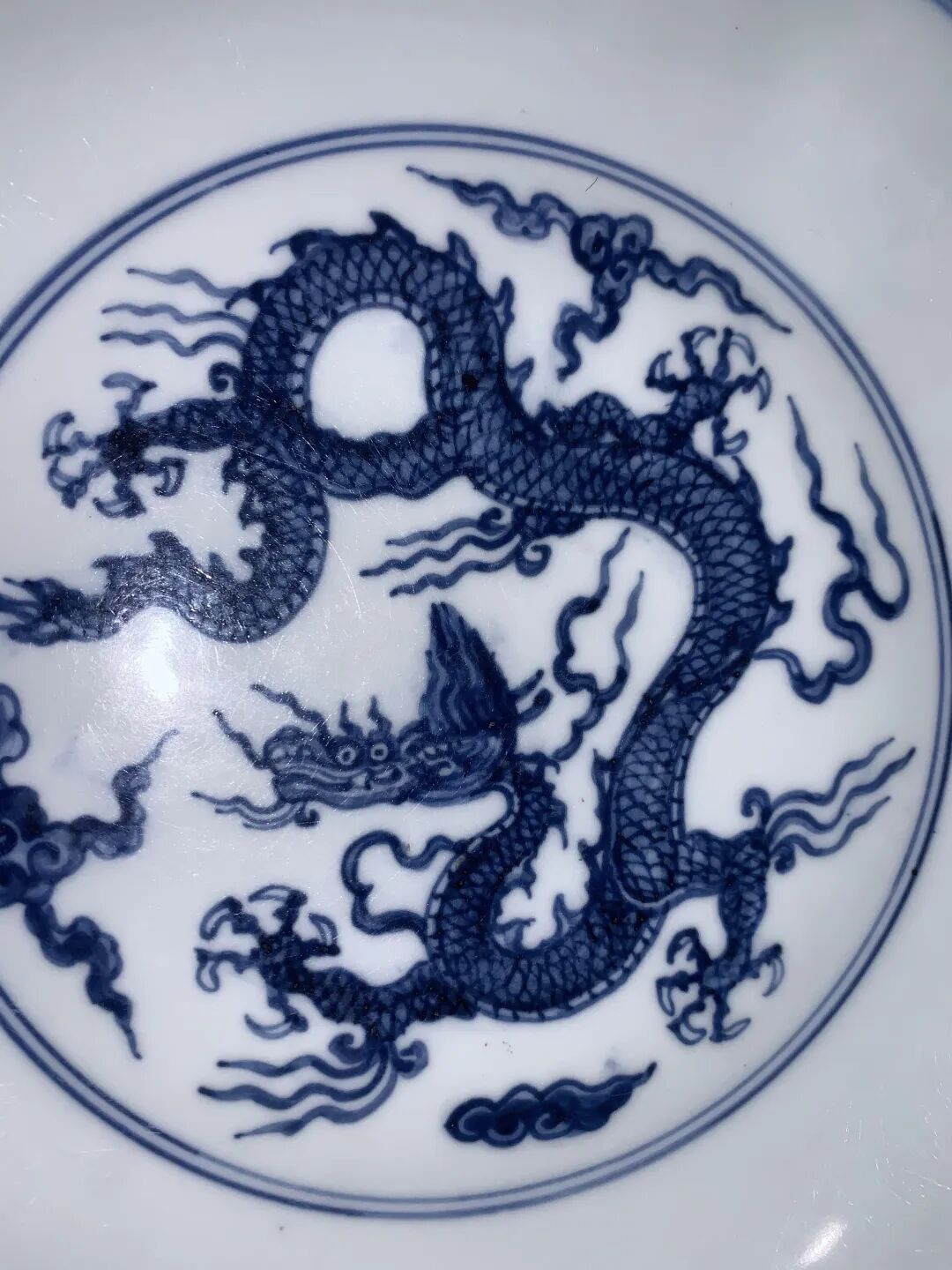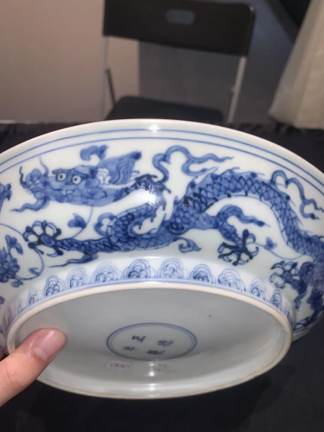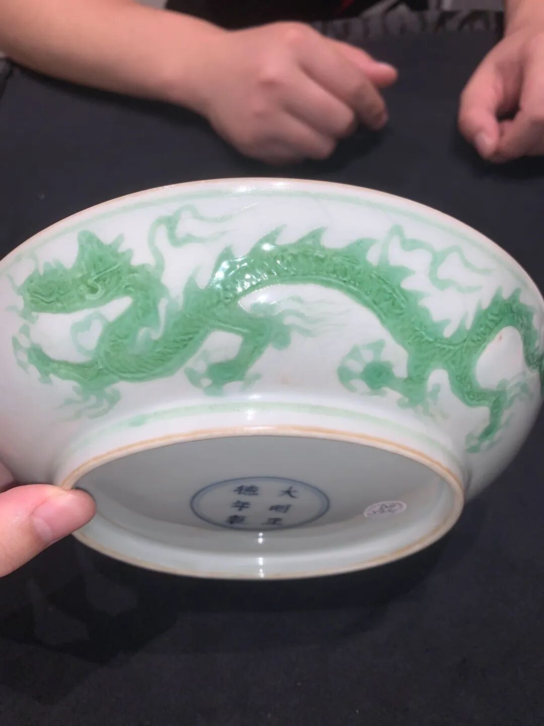 明宣德 霁青釉暗刻朵云行龙纹盘