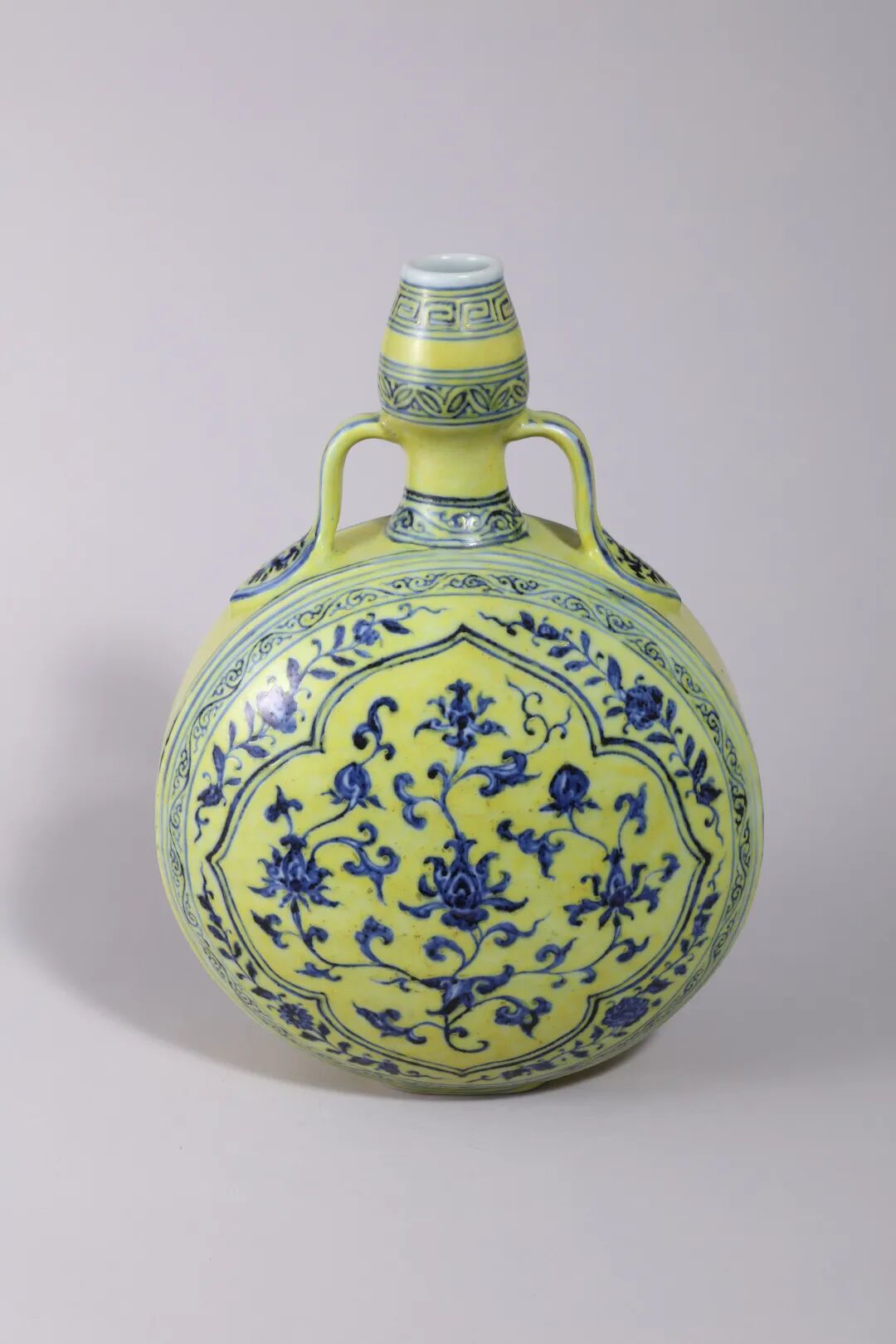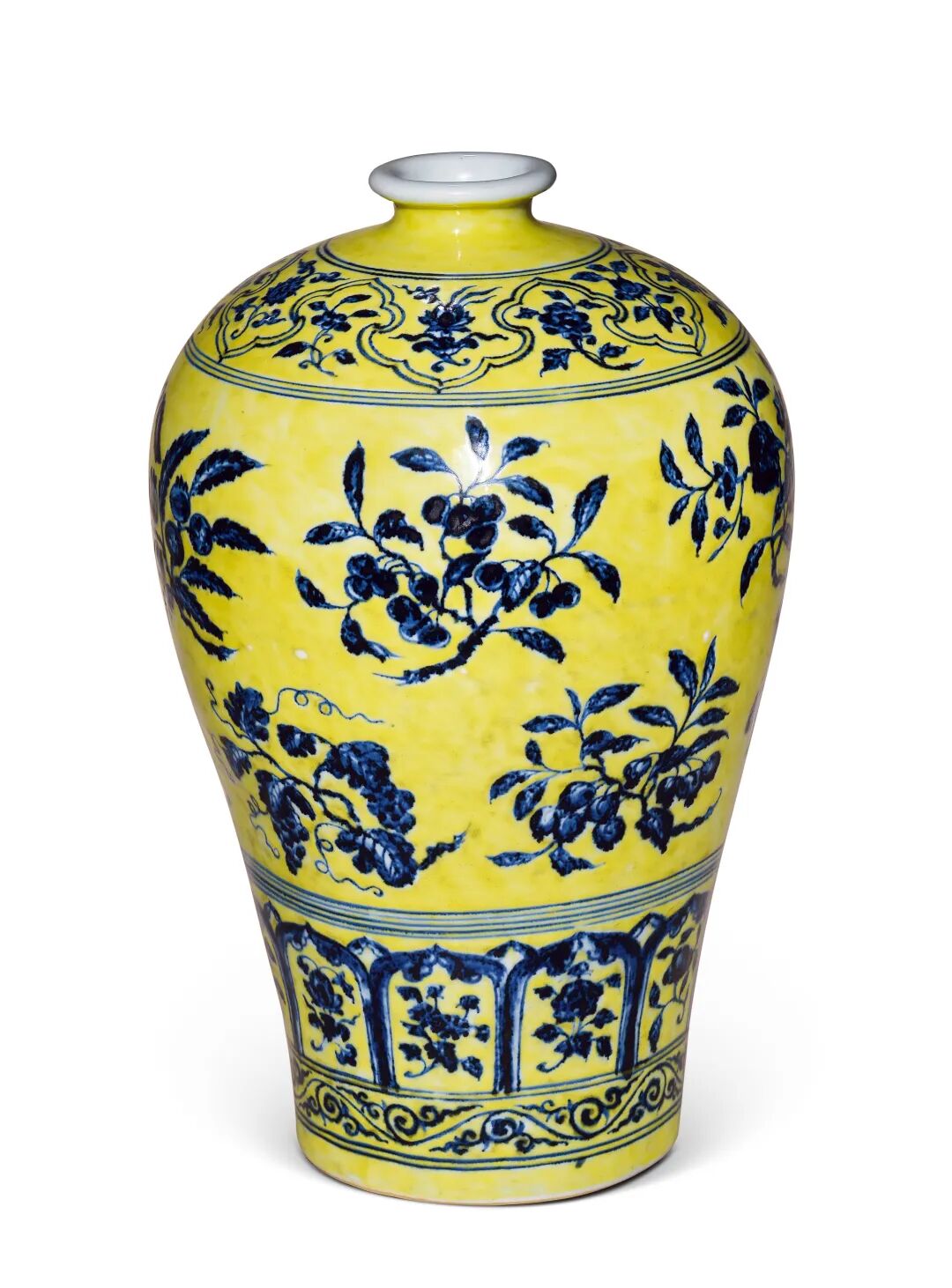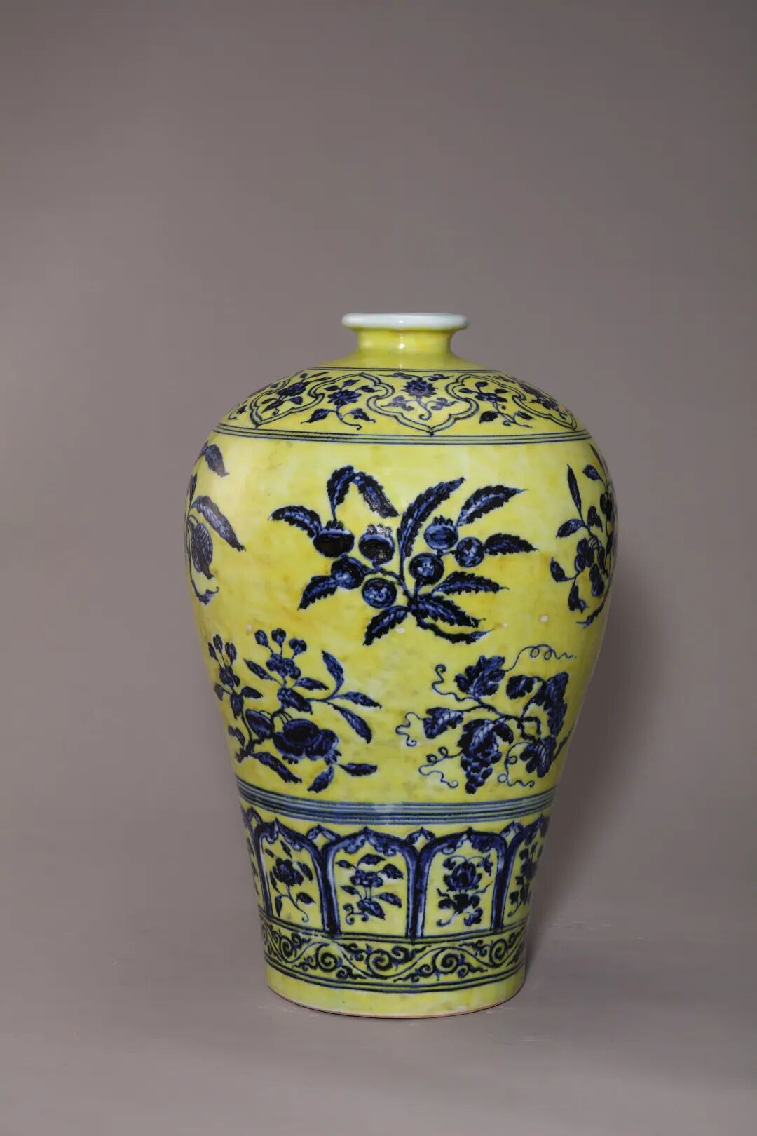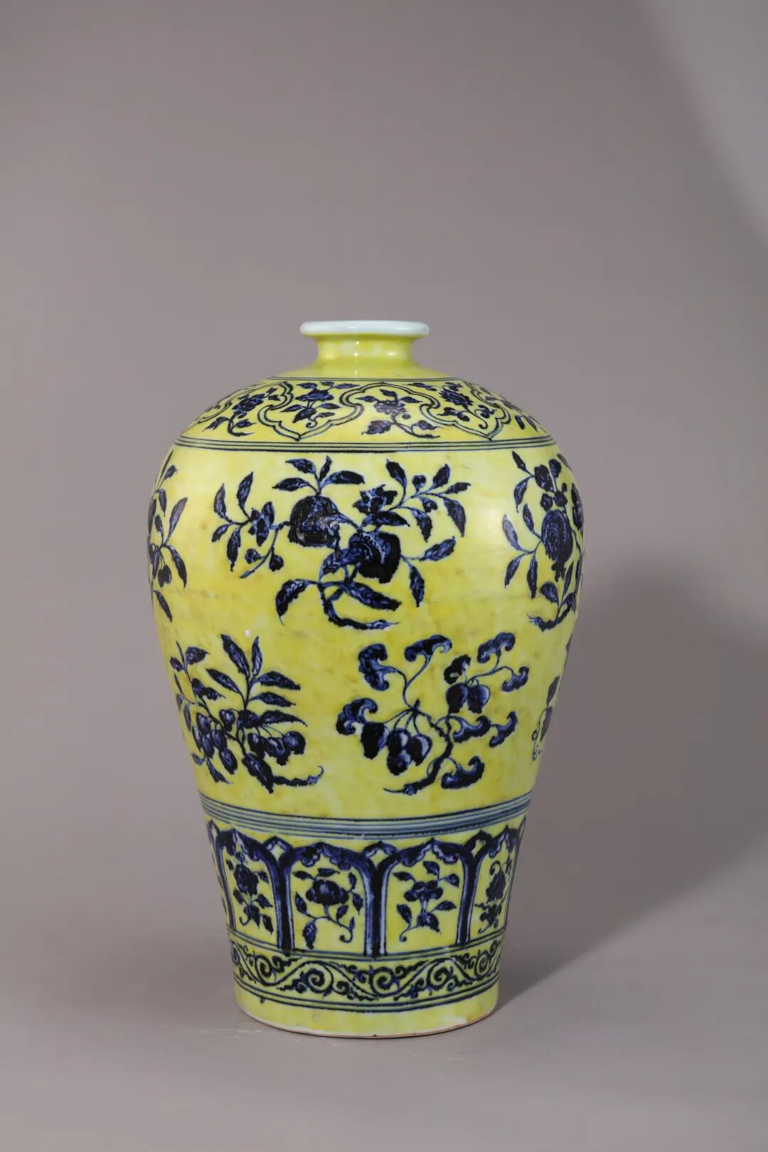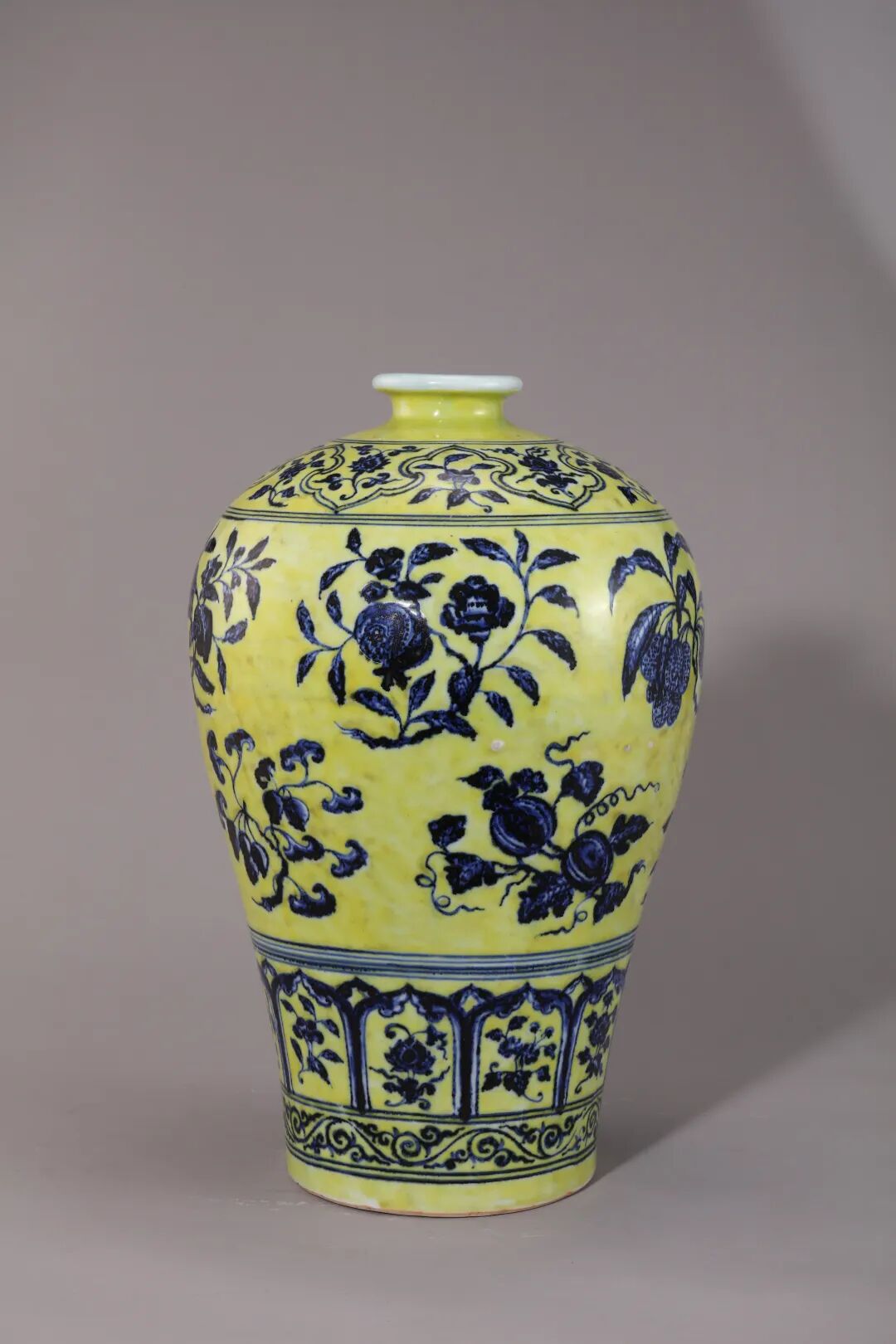 明永乐 黄地青花如意垂肩折枝花果纹大梅瓶