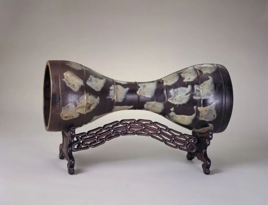 鲁山窑花瓷腰鼓,长58.9厘米,鼓面直径22.2厘米。腰鼓广口,纤腰,鼓身凸起弦纹7道。通体以花釉为饰,在漆黑匀净的釉面上显现出片片蓝白色斑块,宛如黑色闪缎上的彩饰,优美典雅。