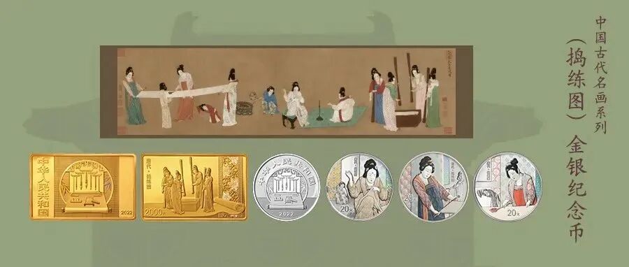 中国人民银行定于2022年8月29日发行中国古代名画系列(捣练图)金银纪念币一套。该套金银纪念币共4枚,其中金质纪念币1枚,银质纪念币3枚,均为中华人民共和国法定货币。该套金银纪念币正面图案均为笔、墨、纸、砚造型,辅以竹叶、窗等装饰组合设计,并刊国名、年号。![]()
