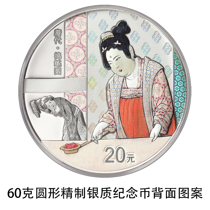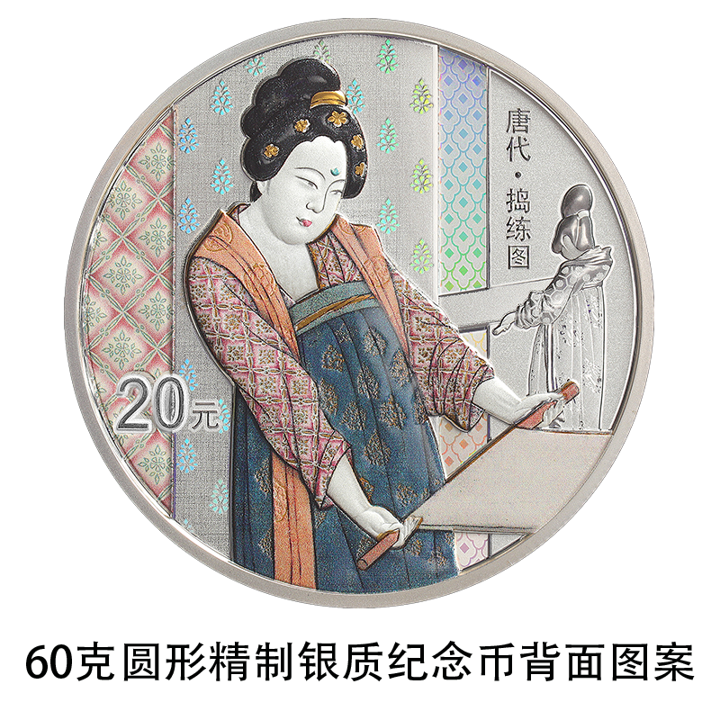 60克圆形银质纪念币背面图案为《捣练图》中缝纫、煽火造型,衬以装饰纹样组合设计,并刊“唐代·捣练图”字样及面额。