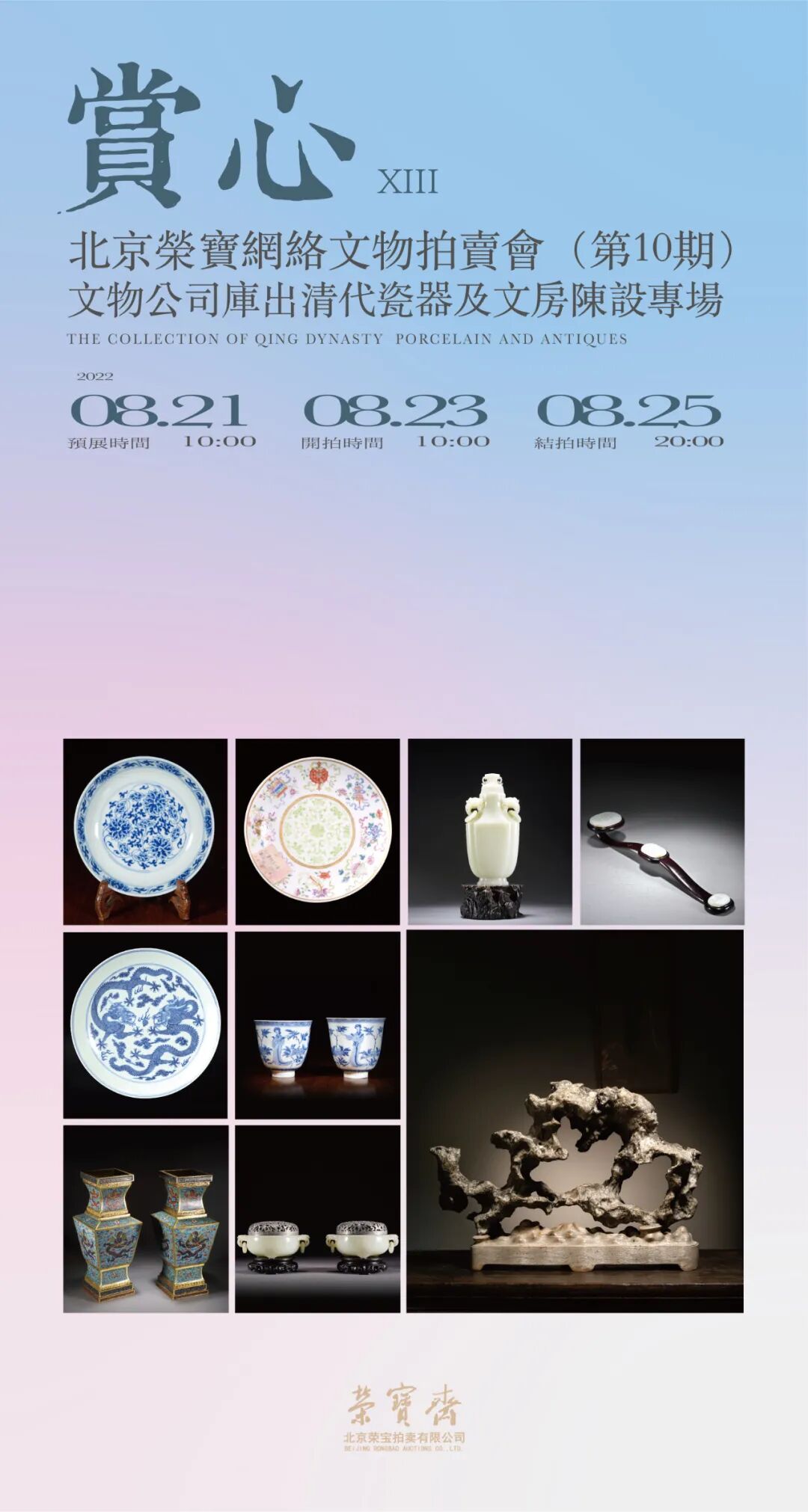 北京荣宝网络文物拍卖会(第10期)——赏心(XIII)·文物公司库出清代瓷器及文房陈设专场将于8月21日10:00—8月23日10:00开启线上预展,并于8月23日10:00开拍,8月25日20:00结拍。