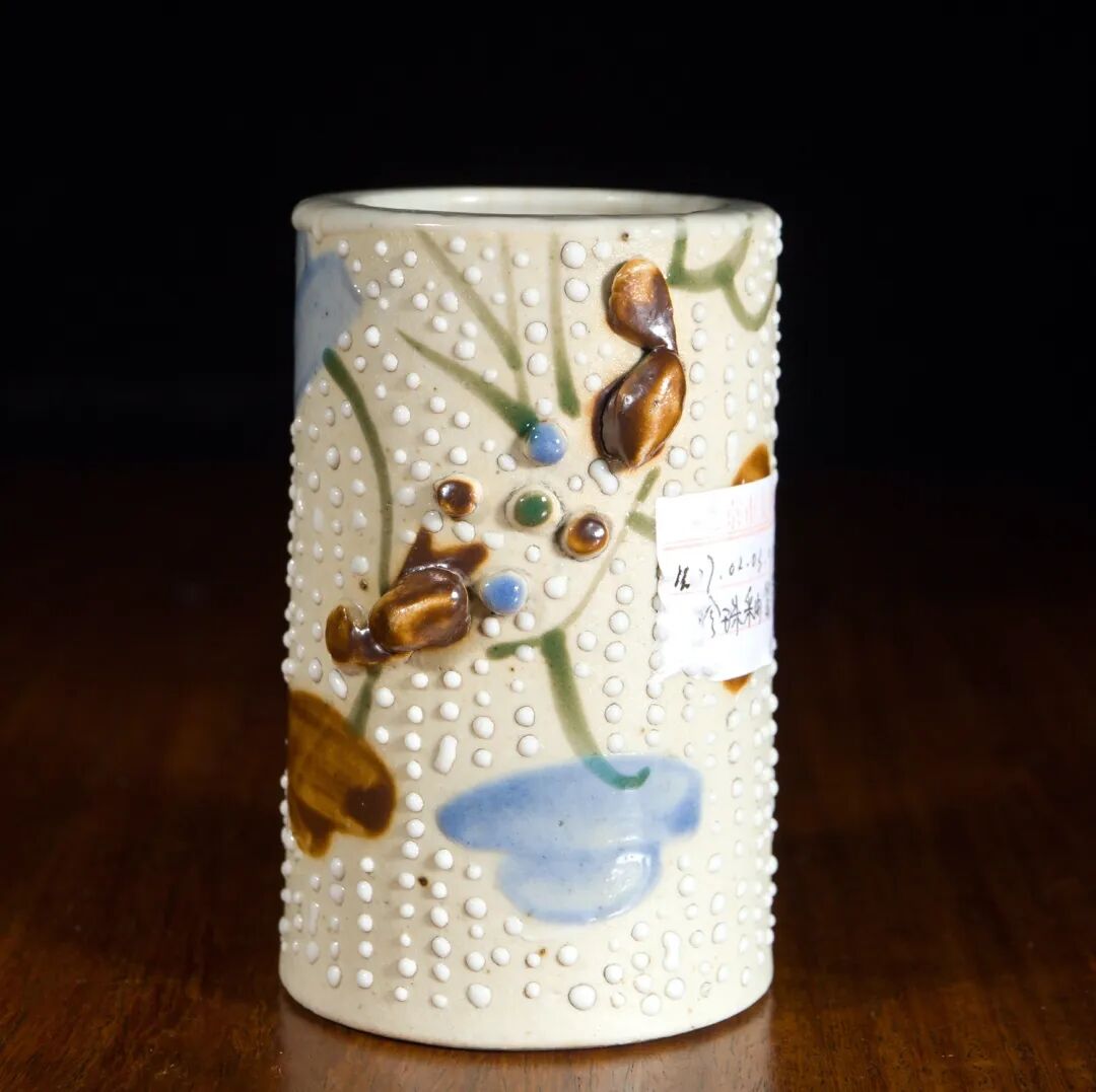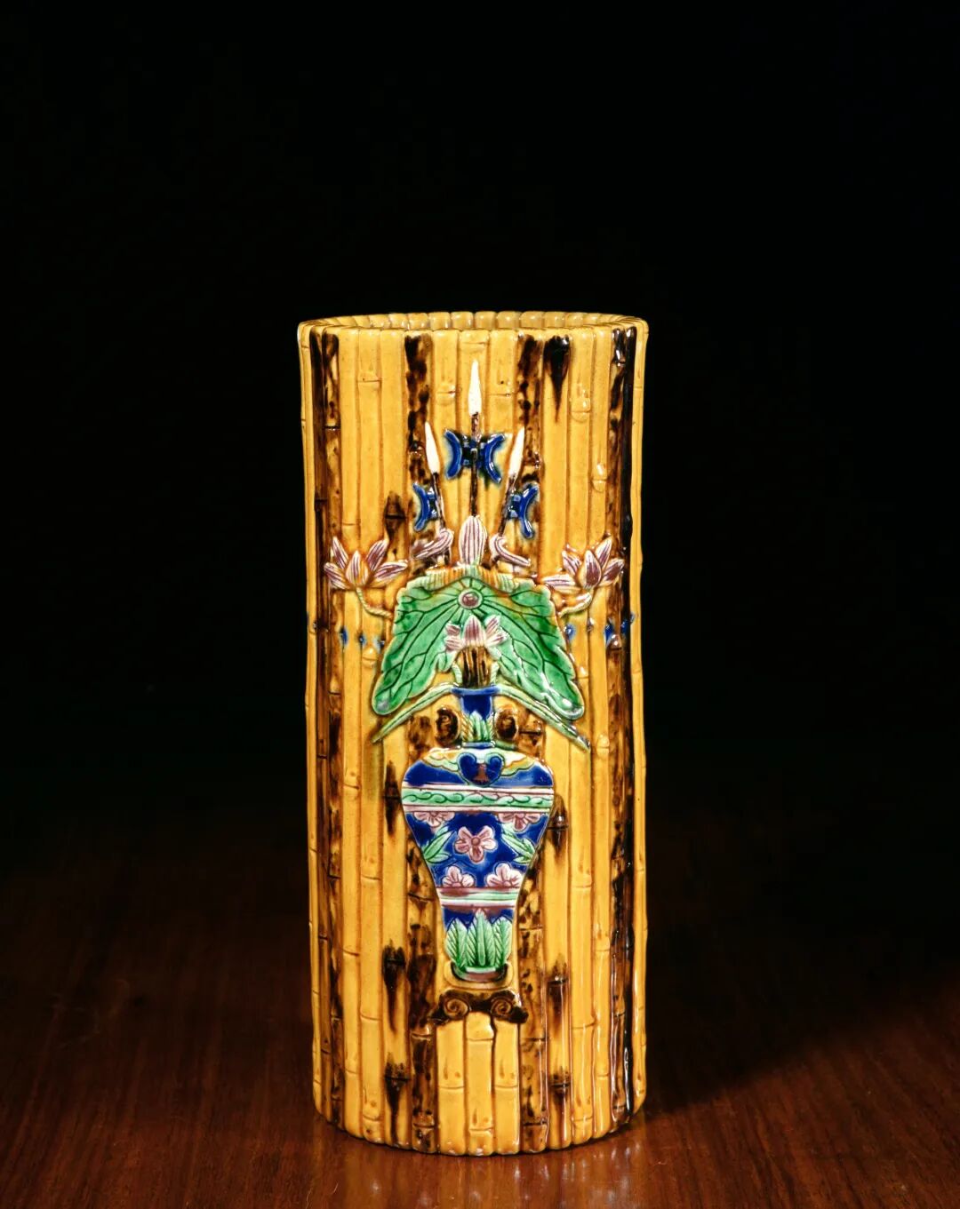 清道光 粉彩雕瓷竹节博古纹帽筒