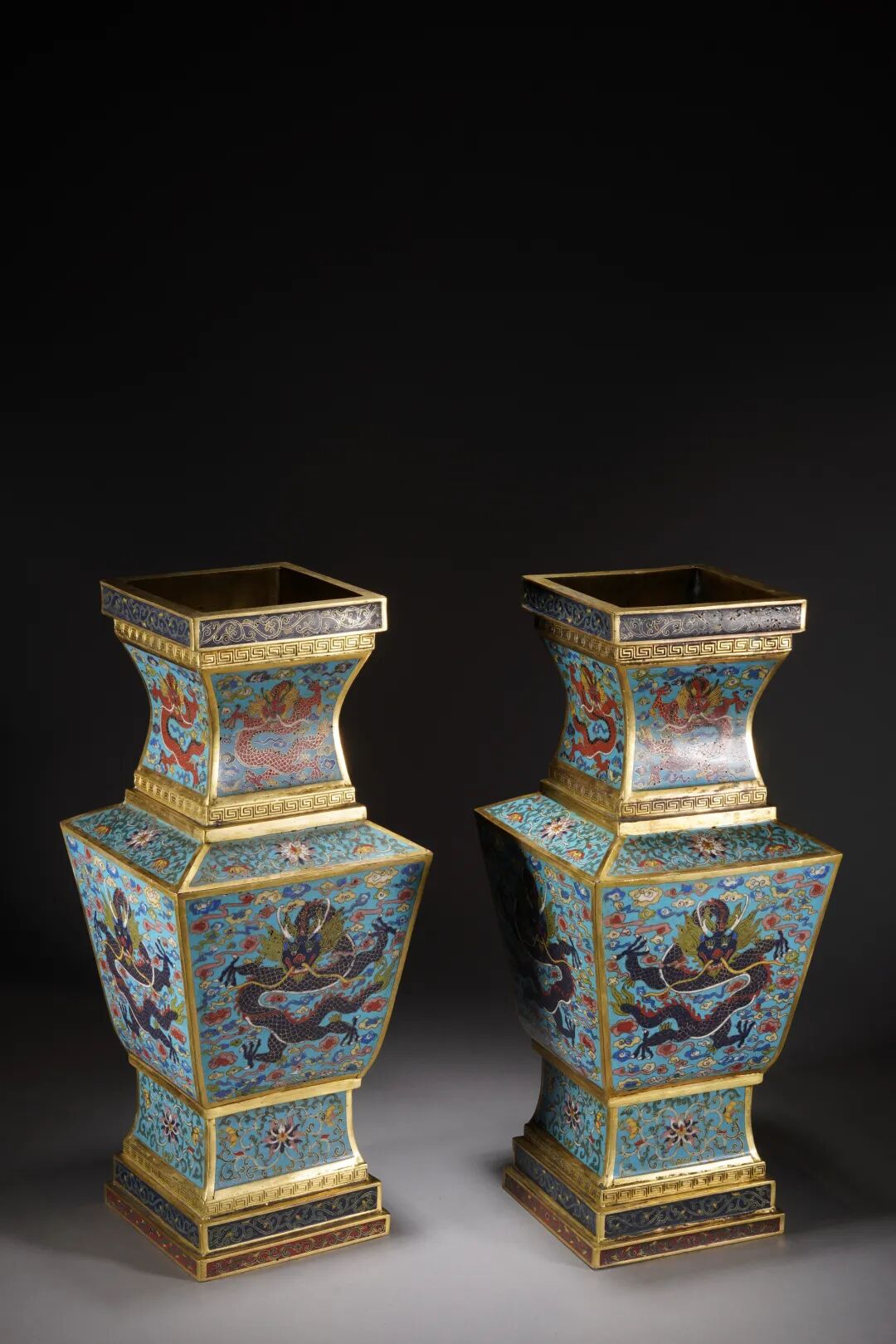 清 掐丝珐琅云龙纹四方赏瓶一对