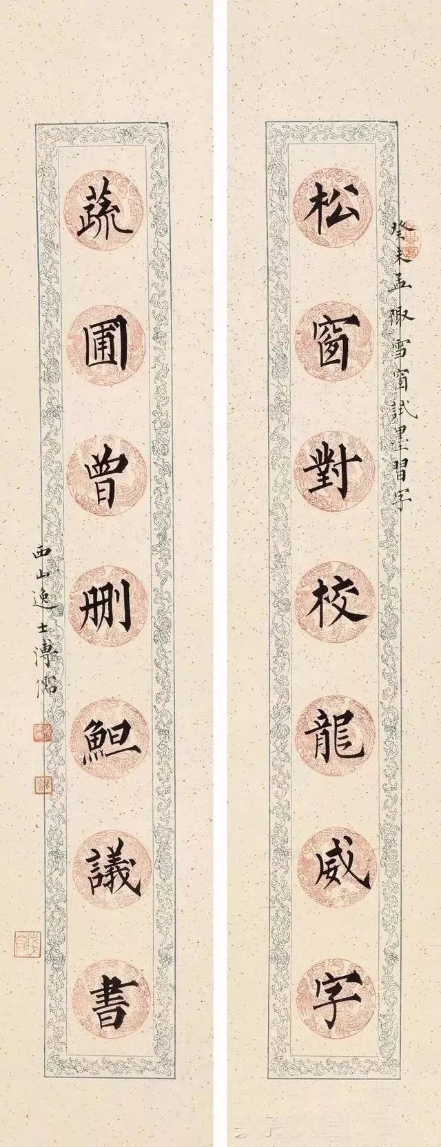 此联刀斩斧齐的笔画、内紧外松的结字,体现出《圭峰碑》的特点。而其空灵,似甚于此碑;横折拉长的笔画,是和尚体所赋予,非馆阁体所能。
