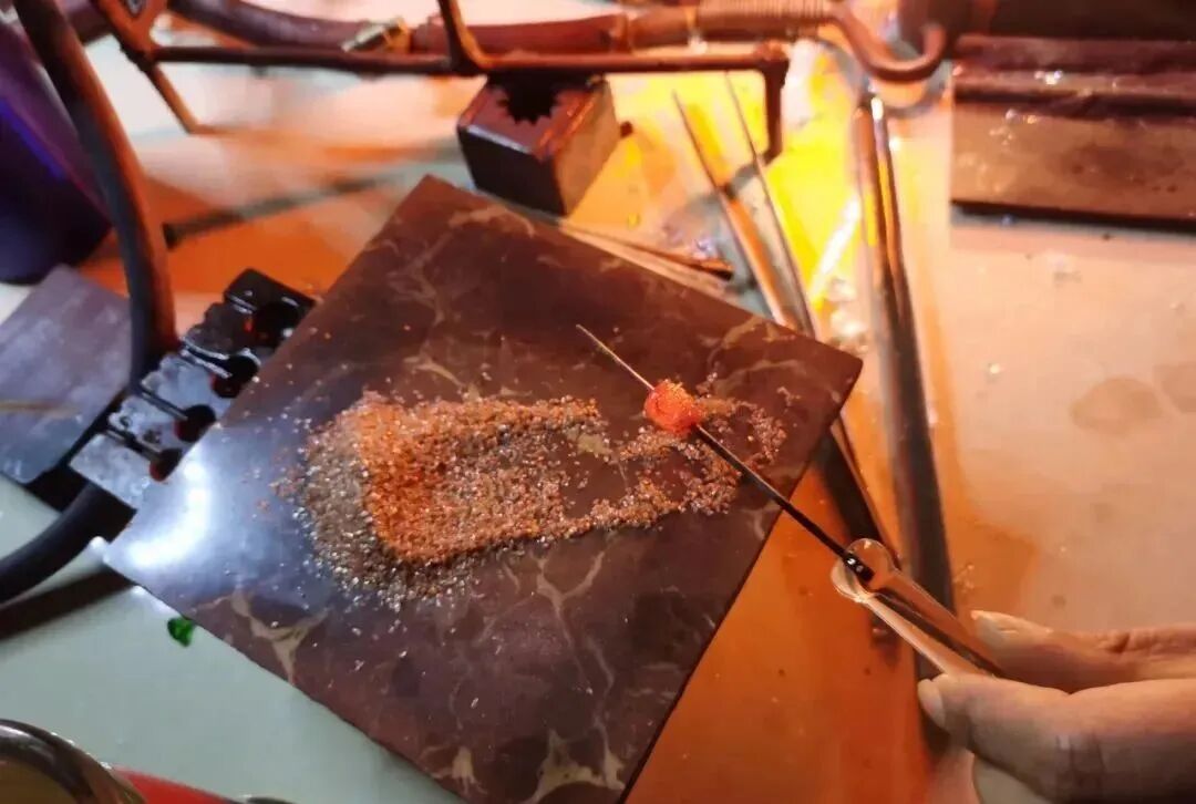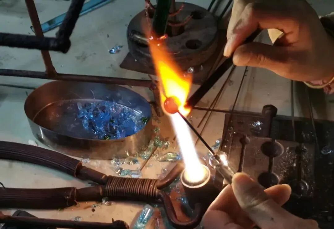 上边主要说的是手工琉璃珠的制作过程,想要知道你的珠子是不是纯手工的,一看大小和形状,手工制作的大小和形状不可能完全一致。二看气泡,手工珠子多少会有气泡,气泡是因为料棒在高温锻制过程中和空气产生了化学反应,我们把这个反应叫做琉璃的呼吸。![]()