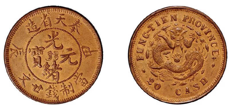 1904年奉天甲辰二十文红铜样币估价人民币600000-700000元;光边, 为红铜试铸样币, 目前记载存世仅二枚, 中国铜元珍罕品种, 精美原光, 品相完美, 完全未使用品。2014年秋季, 拍卖了这二枚的其中之一, 成交价71.3万元。