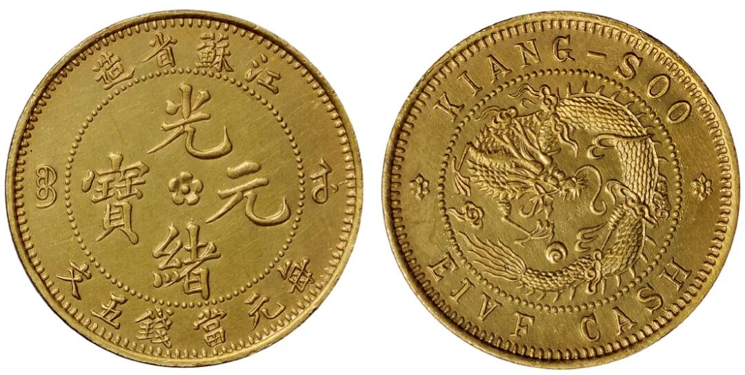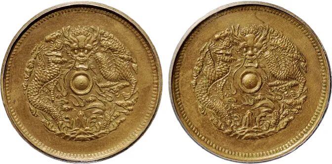 1902年江苏光绪五文飞龙黄铜样币估价人民币20000-25000元;飞龙黄铜样币 图案雕刻精美, 版底光洁无瑕, 品相极佳, 近未使用至完全未使用品。