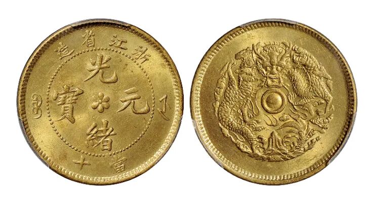 1903年浙江光绪当十合背黄铜币估价人民币10000-15000元;2015年拍卖成交价人民币21850元;黄铜质, 水龙龙珠带点, 品种少见, 评级为GBCA MS60。