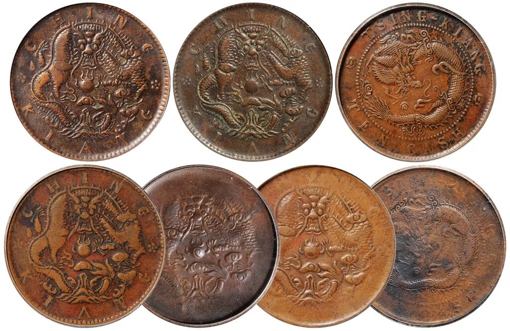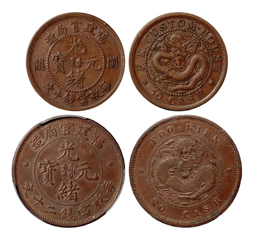 1901年福建官局二十文铜币估价人民币5000-8000元;2015年拍卖成交价人民币14950元;评级为PCGS AU55。
