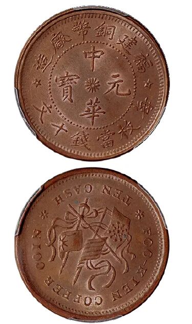1912年福建中华元宝十文铜币估价人民币2000-2500元;2015年拍卖成交价人民币6900元;评级为 PCGS MS63BN。