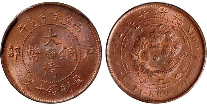 1906年丙午户部大清铜币浙十文估价人民币1000-2000元;2015年拍卖成交价人民币6900元;评级为PCGS MS64RB。