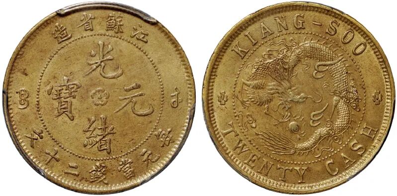 1902年江苏光绪二十文飞龙黄铜样币估价人民币2000-2500元;2015年拍卖成交价人民币5520元;评级为PCGS AU58。