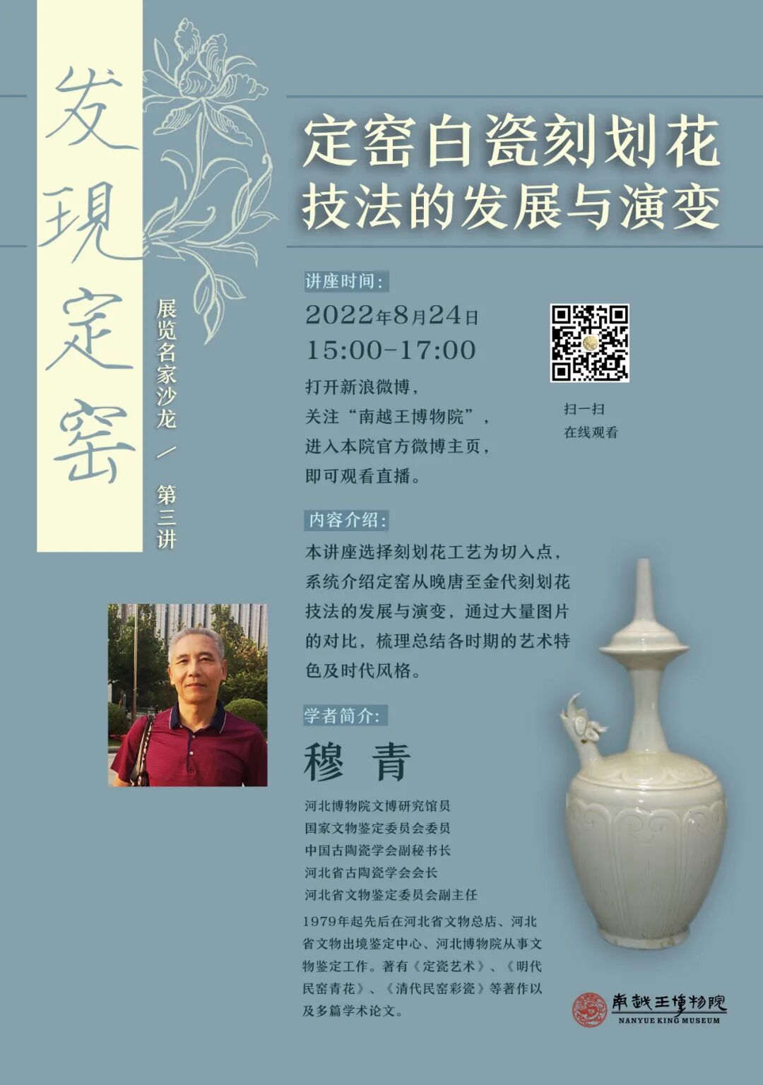 “定窑名家沙龙”即将迎来第三讲,我们邀请到穆青老师为大家讲述定窑白瓷刻划花技法的发展与演变,本次讲座将以线下讲座和线上直播的形式对公众开放。本周三(8月24日)下午三点,诚邀各位观众积极报名、现场参与,或在南越王博物院官方微博参与此次讲座。