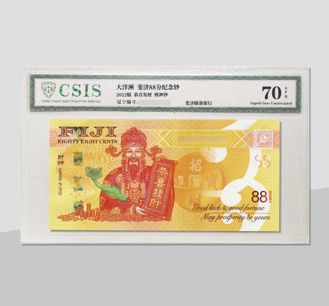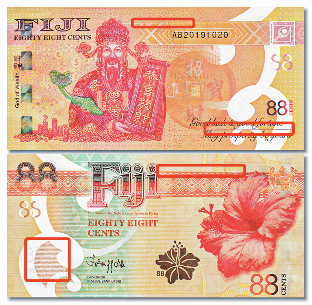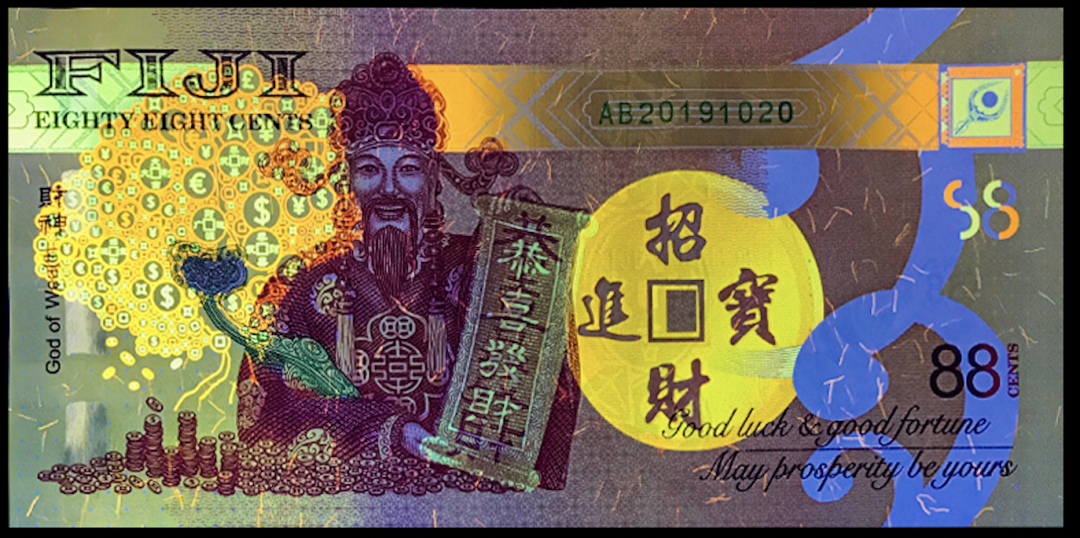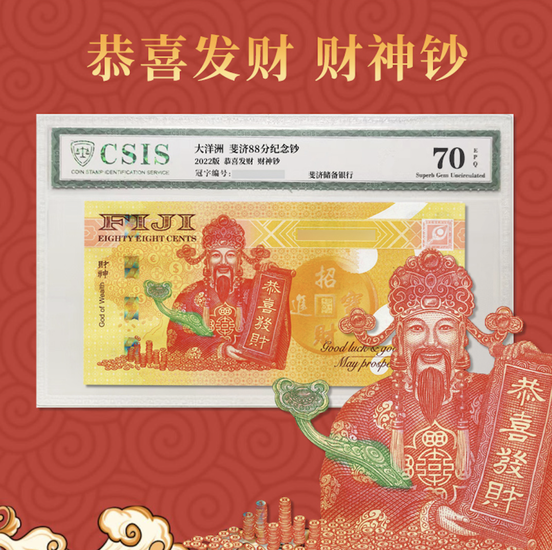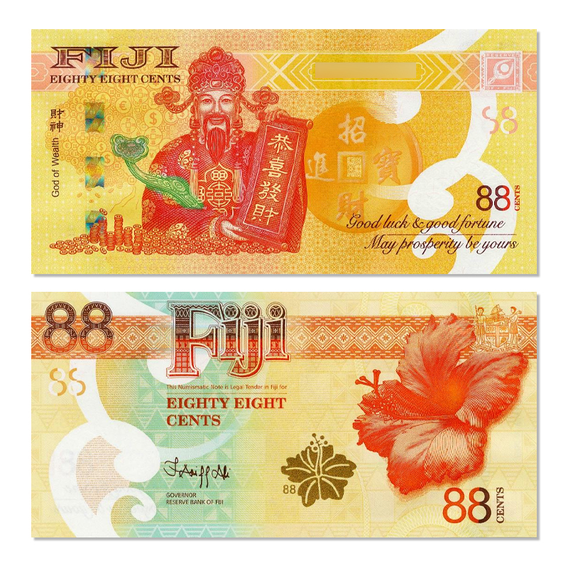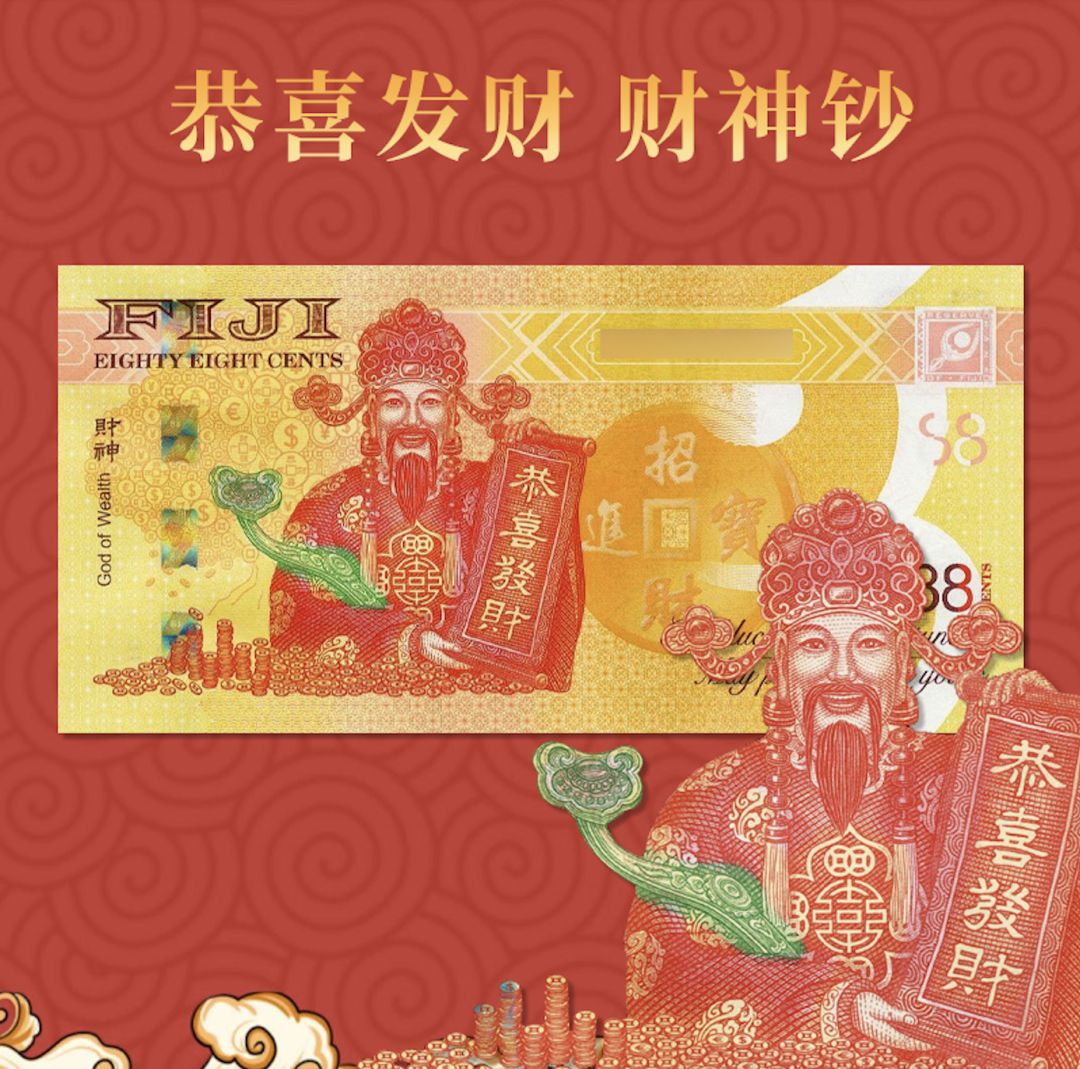 最近斐济又火了(没错,就是王思聪喝的斐济水的那个斐济),当地时间8月8日,斐济储备银行发行了一张面值为88斐济分中国风格的纪念钞——财神钞。![]()