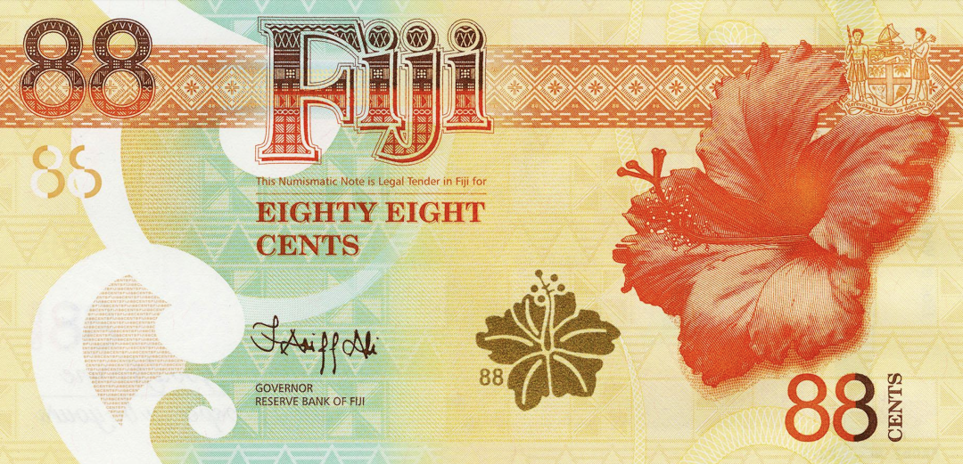 背面是斐济的国花扶桑花,象征着吉祥的寓意。上方的装饰条则是当地象征着财富和地位的塔帕布。![]()