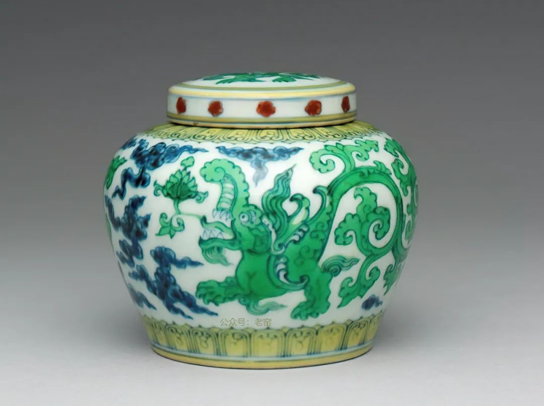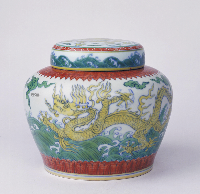 故宫博物院所藏成化斗彩海水龙纹天字罐,此罐原配盖已失,现有的平顶无钮盖当为雍正或乾隆时所配,盖体大,略显笨拙。盖上虽绘与主题纹饰相应的海水龙纹,但色彩亦与罐体有别。