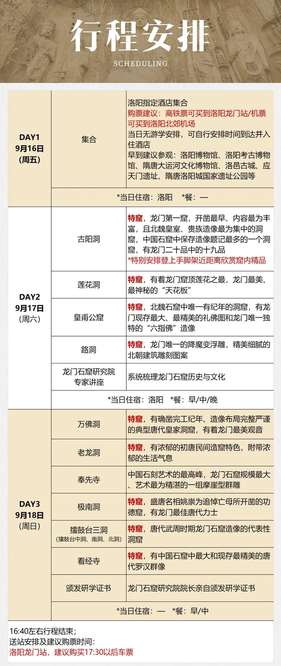 独家原创设计:本次研学深耕游学5年的资深团队设计,线路原创,以不对外开放特窟为主要研学核心,以龙门石窟的两次造像高峰(北魏和唐)为主线,一天一个主题,沉浸式体验佛教艺术和中国古代民族雕塑艺术的最高水平。