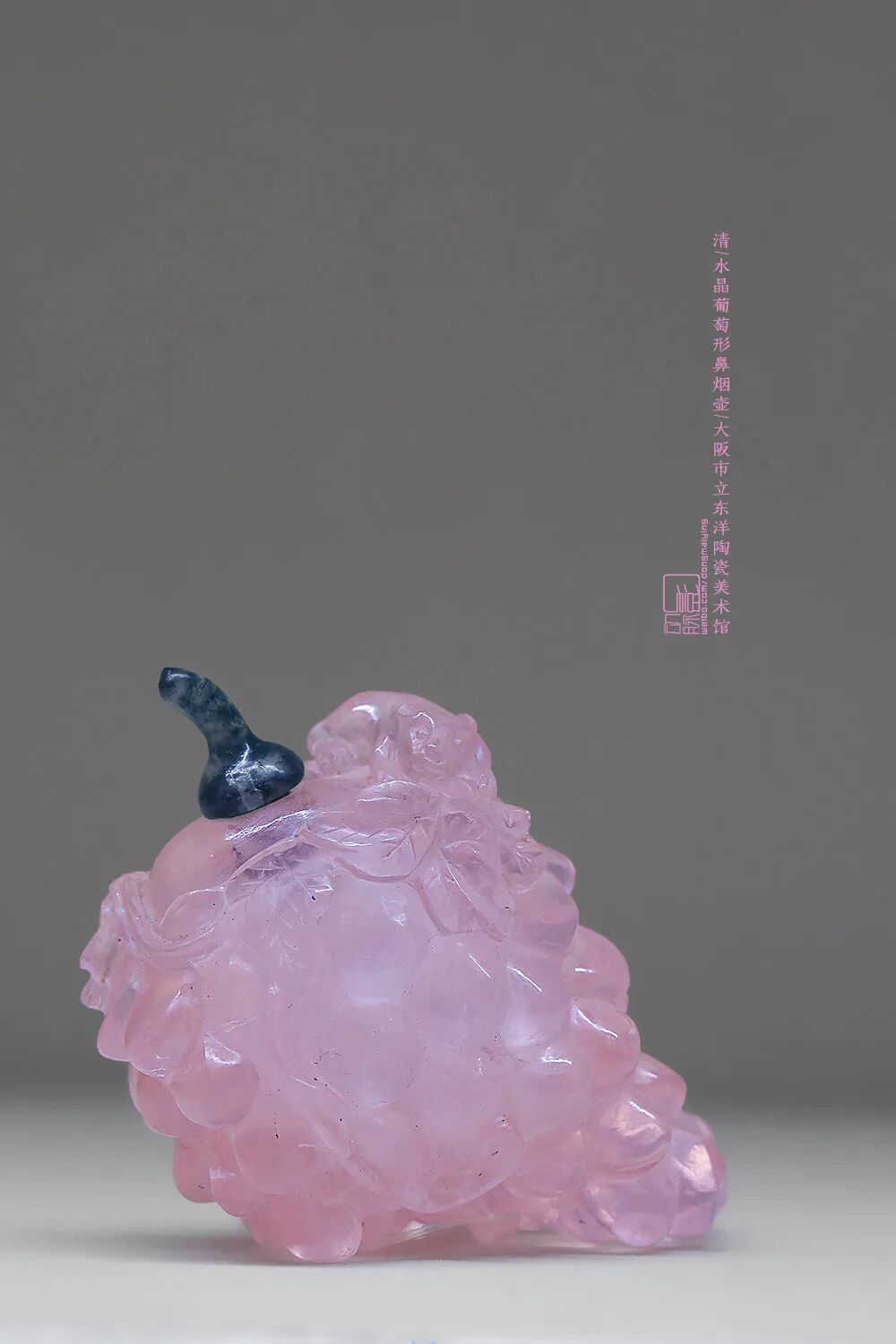 总的来说,清朝的鼻烟壶造型可以分为瓶式壶、肖形壶和联体壶三类。瓶式壶是模仿瓶瓶罐罐造型制作的鼻烟壶;肖形壶就是模仿动植物、饰物等造型制作的鼻烟壶;联体壶,则是包含双联壶、三联壶、四联壶等在内的鼻烟壶,这种联体壶里可以盛装不同味道的鼻烟。以大阪市立东洋陶瓷美术馆藏的两件水晶鼻烟壶为例,上面这件棱形的就是典型的瓶式壶,下面这件葡萄形的就是十分逼真的肖形壶。我们再接着看鼻烟壶上的图案和纹饰,有走极简风的素面无纹款,绘有山水人物、亭台楼阁的也十分常见,融入历史典故和吉祥寓意的同样不少。花鸟鱼虫,珍禽瑞兽,应有尽有。![]()