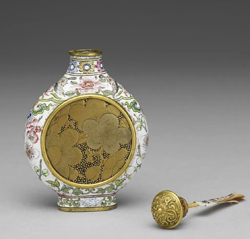 早期鼻烟作为稀罕物,是在达官贵族圈里备受追捧的“小众产品”,不过盛装鼻烟的容器也只是金属盒或玻璃瓶,比如宝玉给晴雯用的鼻烟就装在这样一个盒子里:“麝月果真去取了一个金镶双扣金星玻璃的一个扁盒来,递与宝玉。宝玉便揭翻盒扇,里面有西洋珐琅的黄发赤身女子,两肋又有肉翅……”