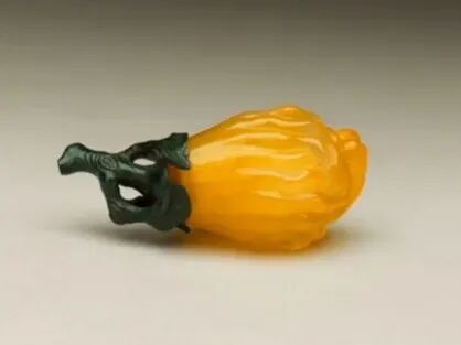 在工艺上,康雍乾三朝的鼻烟壶更是加入了书法、绘画、雕刻、镶嵌、洒金、点翠、掐丝、套料、珐琅彩、鎏金银……坚持的是怎么精巧怎么来:清 康熙 铜胎画珐琅嵌莳绘漆片花卉鼻烟壶台北故宫博物院藏不过材质+工艺并非清代鼻烟壶的全部价值,奇特的造型和丰富的纹样也是加分项。说起造型,康熙时期鼻烟壶的样式并不是很多,当时比较常见的是一种小口细颈、直筒腹壁、平底有旋的爆竹筒式鼻烟壶。雍正年间开始出现更多新型鼻烟壶,既有国外使臣进贡的品种,如各色玻璃鼻烟壶、素鼻烟壶、玛瑙鼻烟壶等,也有造办处创烧的品种,如色彩柔和的粉彩鼻烟壶,当时最受欢迎的是一种形似石榴或灯笼的鼻烟壶。到了乾隆时期,鼻烟壶迎来了自己的“黄金时代”,为官的和经商的几乎是人手必备,鼻烟壶的造型也从最基本的扁瓶,发展出了圆形、筒形、四方形、多棱形:更有葫芦、茄子、南瓜、葡萄等果蔬形以及其他看起来就“奇奇怪怪可可爱爱”的形状——右:清 玉髓佛手鼻烟壶 台北故宫博物院藏