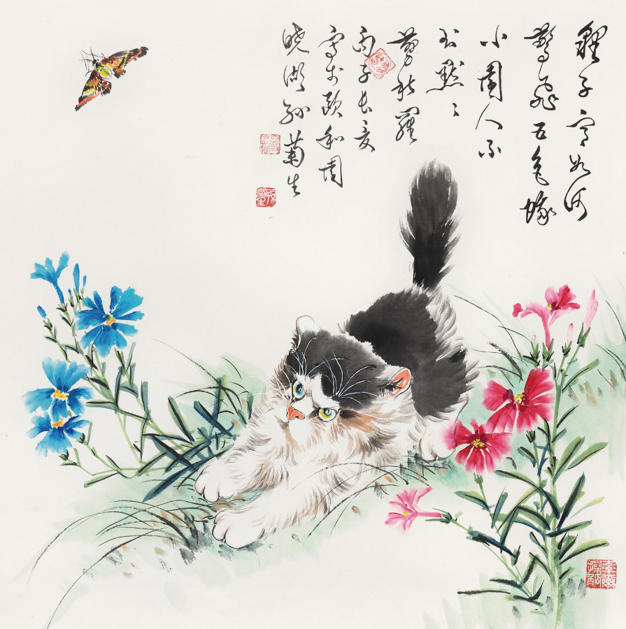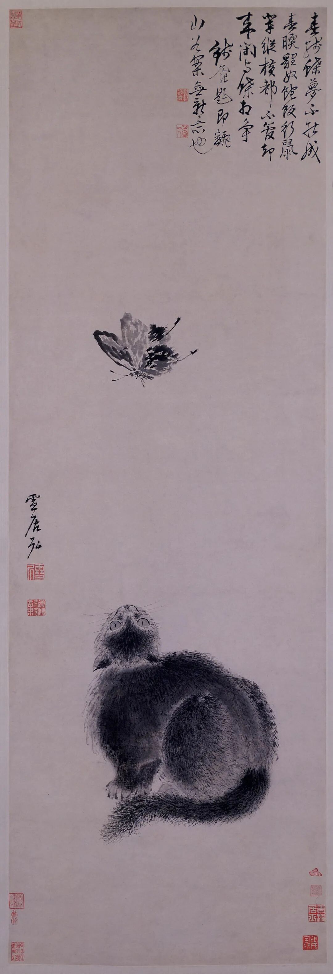 明清时期文人画发展达到鼎盛,此类猫蝶图的寓意是作者个人心境的写照。中国国家博物馆藏清代恽寿平绢本设色《秋卉狸猫图》,绘一只黑白相间的猫,双目圆睁,屏息凝神,以猛虎下山之势伏于坡石上;花卉山石以没骨叠色法写就,雅致多姿。左上自题七绝一首:“偃草雄风势壮哉,怒猊腾掷下苍苔。于今社鼠应难捕,闲觑花阴蛱蝶来。”
