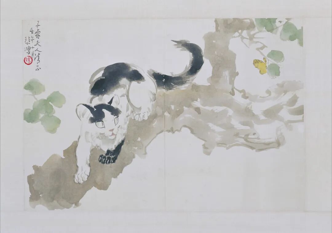 徐悲鸿养猫、爱猫,画猫逼肖传神,所作猫蝶图除祝寿外,往往还托物言志,以猫寄托个人情怀。他的《枫叶狸奴图轴》设色清淡,小花猫在树上俯身回望,栩栩如生。