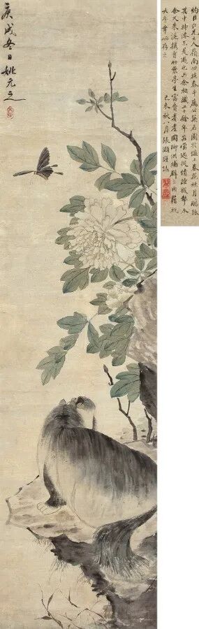 此轴为恽寿平五十二岁时所作,正值其画风最为成熟、创造力臻于巅峰之时。作者由诗点画,将落拓与苍凉隐于耄耋富贵表象之下,慨叹时运不济,社鼠猖獗却难有所作为,英雄实无用武之地。观赏此画,似能体会到其历经丧乱和清贫的一生。