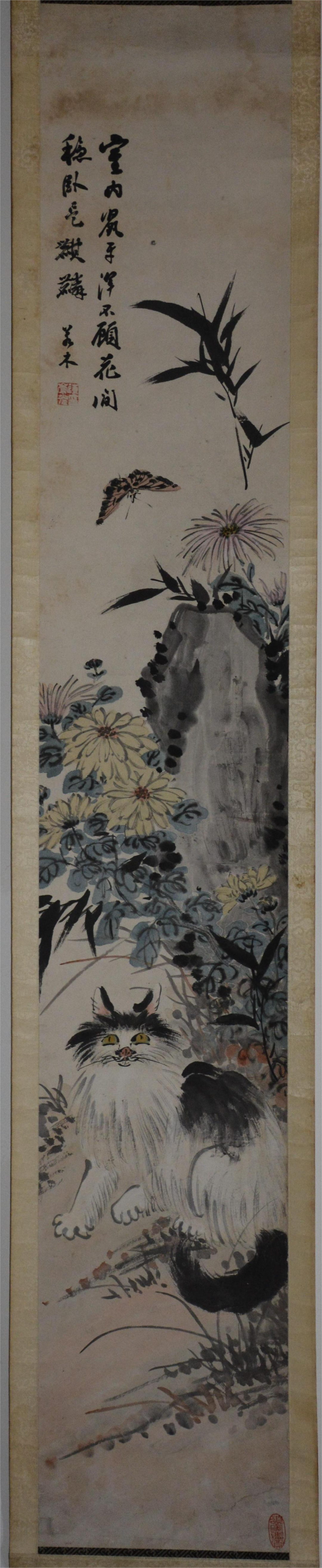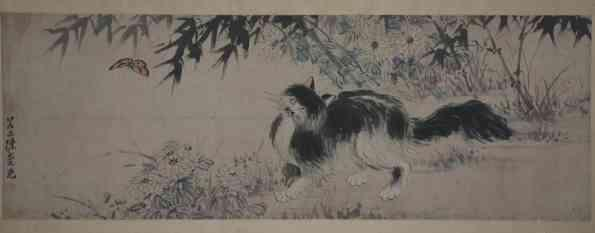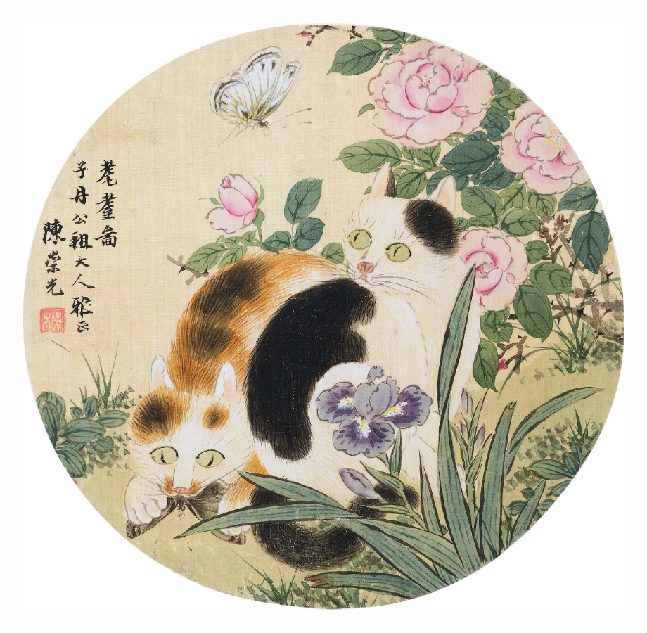 泰州市博物馆所藏清代陈崇光猫蝶条幅中,以随性之笔画猫,头背部用浓墨擦染,肚皮处的白色毛发以淡墨勾勒,猫尾以干淡墨皴画,面部用细笔描绘出双目圆睁的神态,一只毛发蓬松、膘肥体壮的小花猫跃然纸上,憨态可掬,惹人怜爱。蝴蝶染以橘红,点缀黑色斑纹,头身纤细,一须一足纤毫毕现。画面布局疏密有致,手法粗放老辣,涉笔成趣。卷后有浮玉老人张太素的题记,极言其画作之清妙。