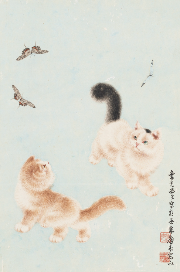 明清之际,猫蝶名作颇丰,明代孙克弘、商喜、陆治、戴进,清代沈振麟、沈铨、程璋等人均有猫蝶作品传世,近现代名家更是不胜枚举。这一时期猫与蝶的内在联系更紧密,不仅象征吉祥富贵、福寿绵长,还常隐喻画家本人的精神境界和人生追求。