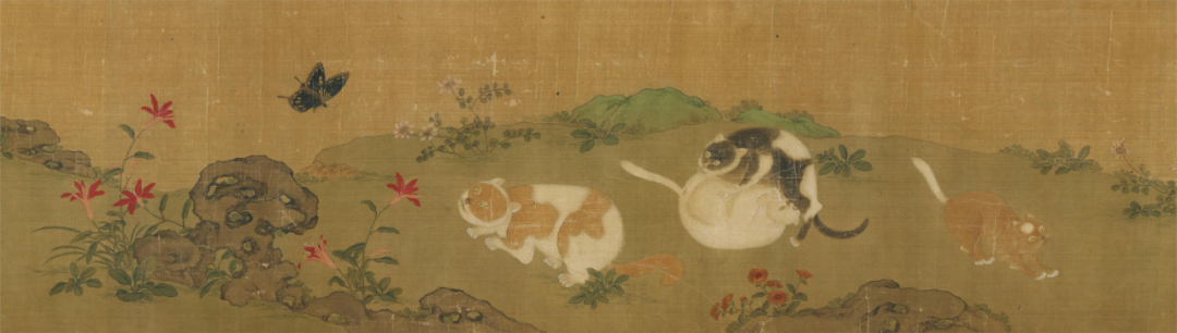 图卷描绘五只花色各异的小猫在花丛中扑蝶玩耍、嬉戏打闹,一只“玳瑁斑”将蝴蝶衔于口中,活泼顽皮之态尽显。画面笔触工细,敷色鲜明,生动可爱,显示出吉祥安康的美好寓意。