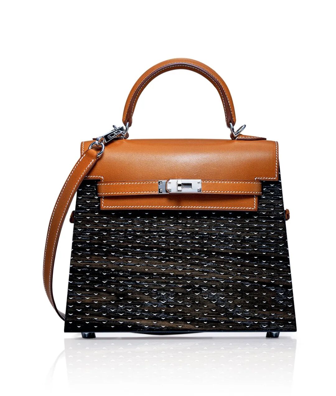 爱马仕的首款木制手袋 KELLYWOOD 于 2020 年惊喜诞生,包身采用珍贵的 BARENIA 马鞍皮及千年木材精制而成,普推出便成为拍卖场上的百万手袋之一。
