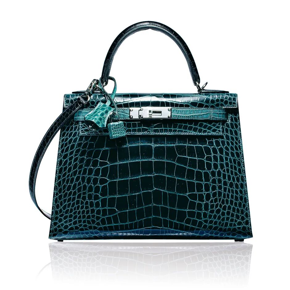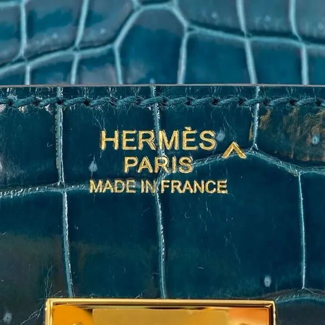 亮面翡翠绿色 Porosus 鳄鱼皮 30 公分柏金包附金色金属配件
