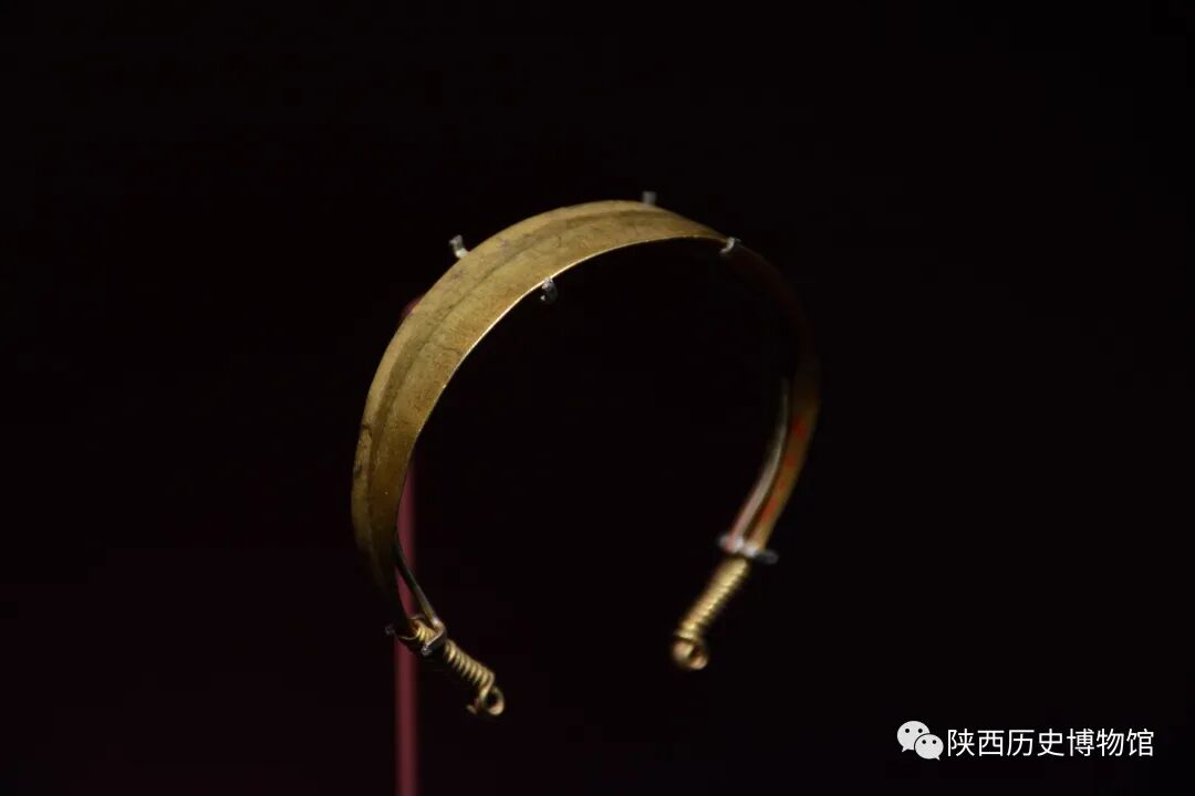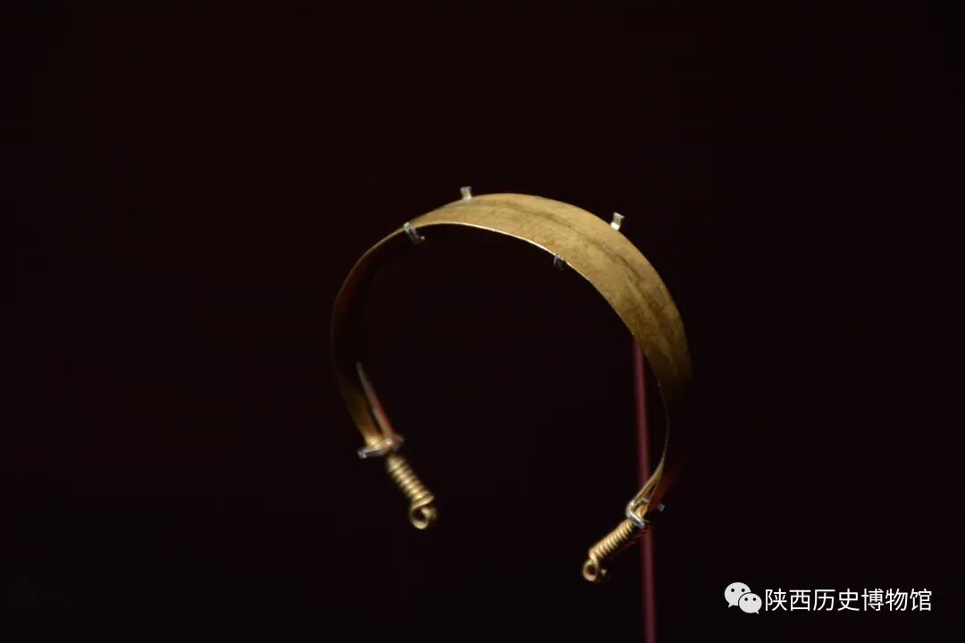 金臂钏:由一整块金条打成,中间宽,逐渐向两头变窄收成直径0.9毫米的金丝后,并绕三层成环首,再向后缠绕14圈,两端形成约2厘米的长度最后收口。