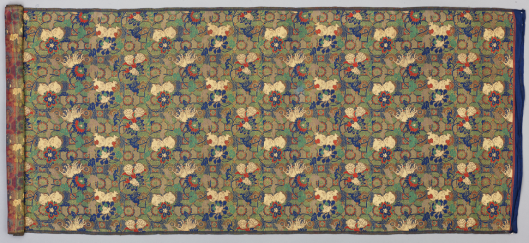 ▲清乾隆 蓝色地福寿三多龟背纹锦 故宫博物院藏