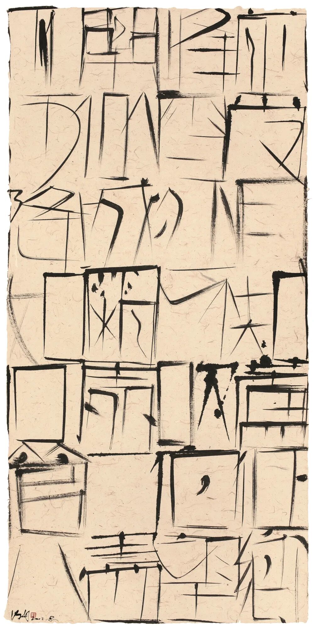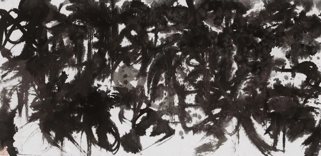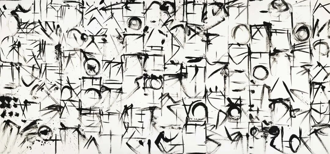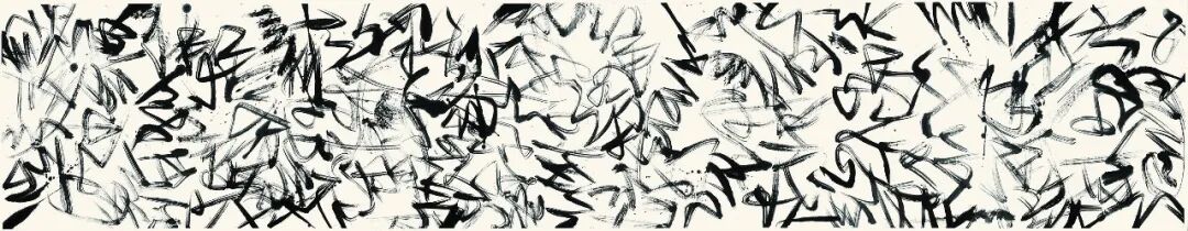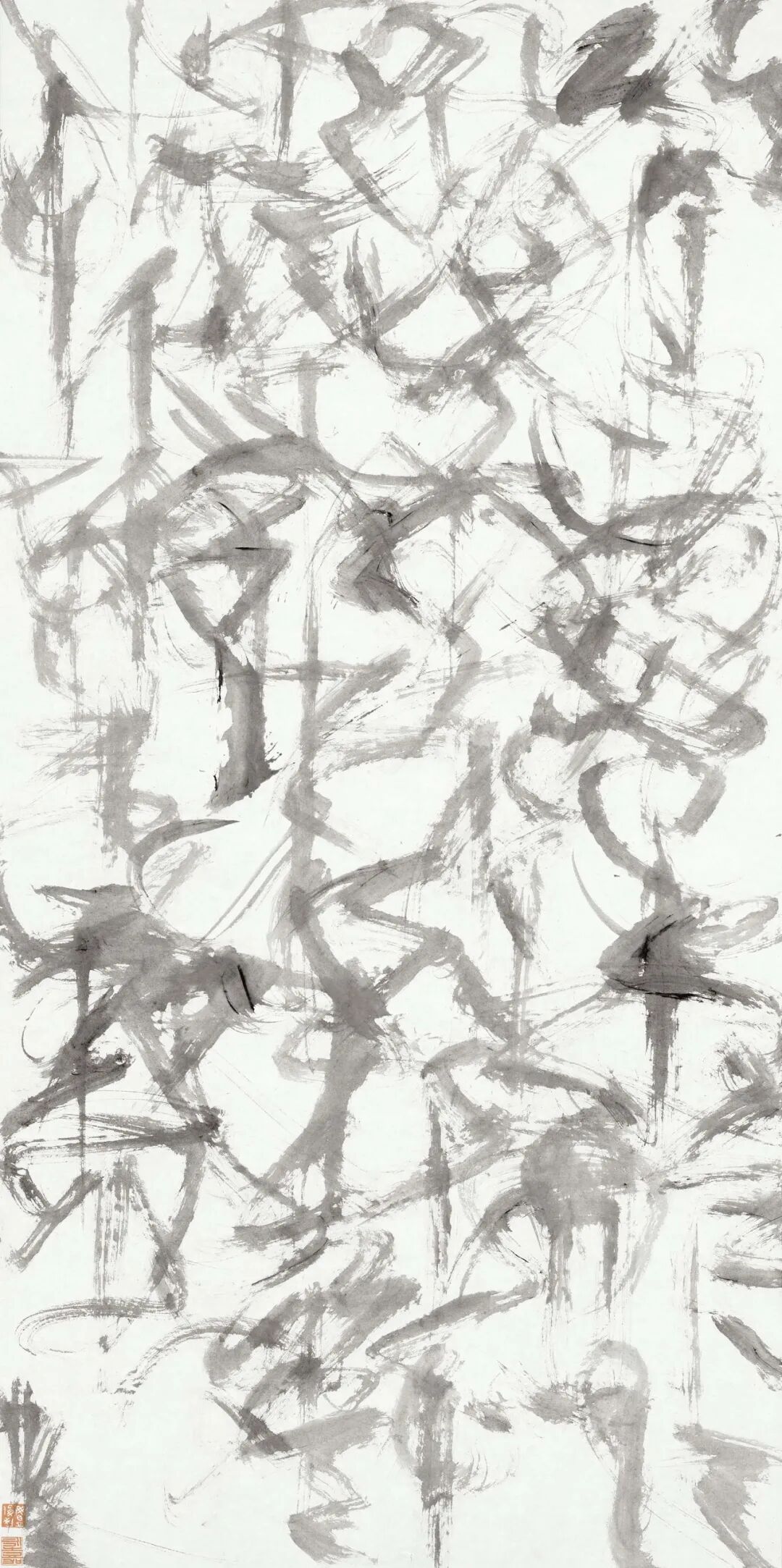在這一點上,盧俊舟選擇出離。在他成熟期的作品中,我們看不到字意,看不到字形,看不到行楷草隸篆的結體變化,看不到吳道、王孟式的經典書畫線條。他的作品並不像以往我們看到的書法作品——以文字的含義,向觀者傳遞一種較為確定的情趣。嚴格意義上說,他的作品是抽象的。