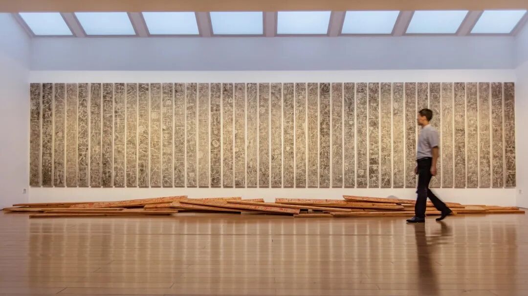 在表現蘇州時,盧俊舟再次選擇出離。在《吳越春秋》中,他用朱砂在40塊220x20cm的木板上,寫上《史記·伍子胥列傳》中伍子胥為太宰伯嚭所害,臨終前所言“抉吾眼縣吳東門之上,以觀越寇之入滅吳也”的段落,再用斧頭沿筆痕劈砍,最後用墨包裝成拓本。