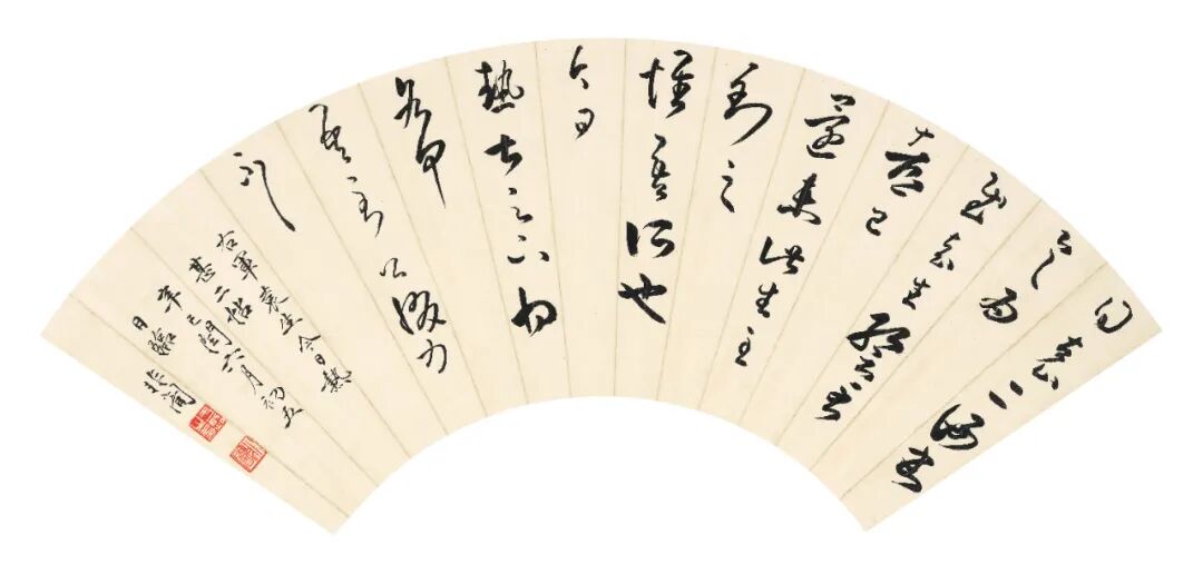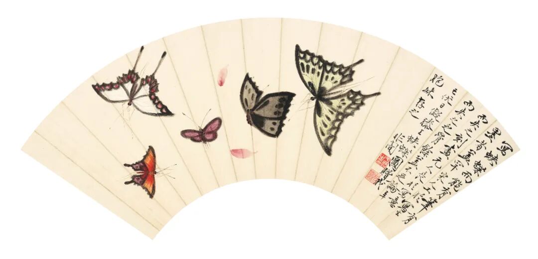 香港苏富比,近现代中国书画,2000年5月1日,编号216;香港苏富比,中国书画拍卖,2017年4月4日,编号1210此箑乃于非闇画赠其胞妹销暑之作,于氏兄妹六人,他排行老大,共有三个妹妹,不知此箑为其中谁作。一面画蛱蝶逐桃红,看似工笔,细看却出之兼工带写之法。用略带散锋之粗笔擦写出蛱蝶轮廓,竟令蝶翅驾风之势跃然纸上,足、须、目用或浓或淡,极细而劲挺之笔写出,则使蛱蝶顿添骨力生机,此箑画拟赵昌之画意,然画法则全然出于于氏一己。二十世纪工笔花鸟画家,于非闇卓然而出,正在于其融写意于工笔,避免一昧工致细巧,而呈现笔墨高韵,文人意味。另面书法乃于氏临王右军二帖,《今日热甚》帖甚符伏日节气,想必是兄长为博妹一笑,特意择之吧。![]()