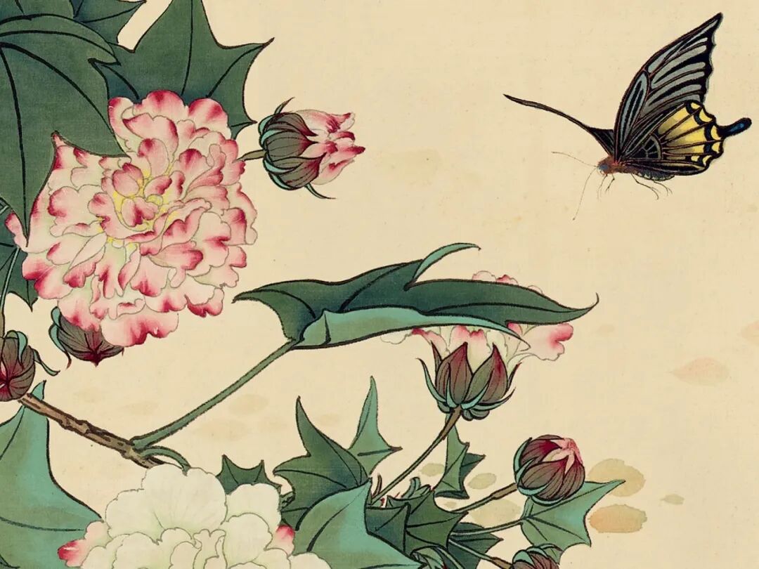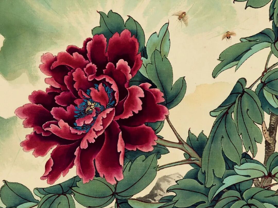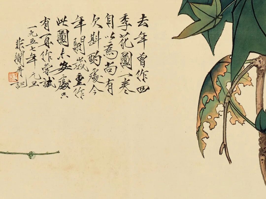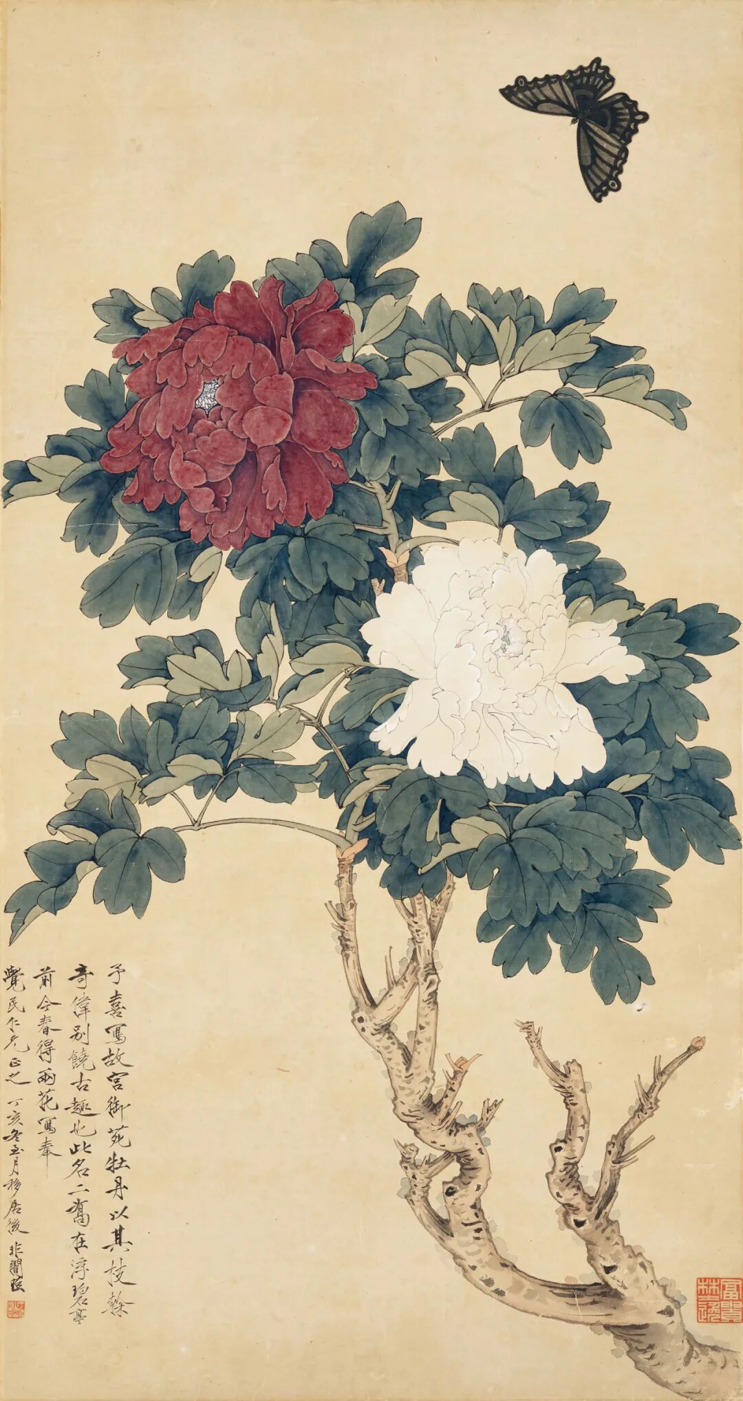 除牡丹蛱蝶,于非闇于本幅中更留得近三分之一画面描绘老干虬枝,以其 “奇伟别饶,古趣也”。于氏对北京牡丹研究甚深,曾特别提到北京公园的花木都由专门技师栽培,惟故宫御花园中的牡丹,似乎在一段时期无人照管,或照管束缚得不太紧密,多年的老干曲屈盘错,极可“入画”。于氏作画,非简单采用写生,而是取不同季节最佳物象,春季的花朵,夏天的叶形,初秋的枝干,如此积年累月地搜集,方才下笔如有神。只画折枝牡丹,有的只画几根竖干,这对于构图来说,是与牡丹的富丽堂皇不相称的。画家们只在春天找到形色,未看到夏天姿态百出的叶片,初秋曲屈盘错的老干……我画牡丹不死守陈法,而要使它尽态极妍,比真的牡丹还要漂亮鲜艳。