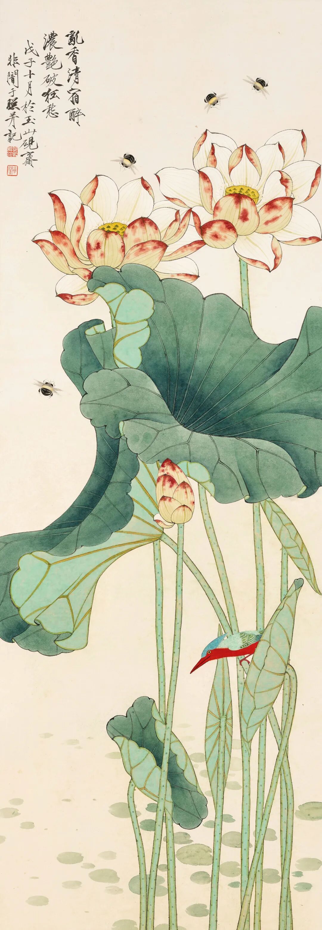 估价:港元 1,200,000 - 1,800,000本幅乃于非闇工笔创作成熟期精心之作。莲池中红荷盛开,碧叶如云,金蓬纳翠子,正合画上所题宋人刘敞《荷花诗》中 “浓艳” 之谓;而 “乱香” 则以群蜂缭绕,穿花度叶点题。刻划上画家亦是惮精竭力,尽其精微之能事,工致而不失于死板,叶梗及叶背之叶筋更以金色勾描,整幅作品竟添庙堂之气。![]()