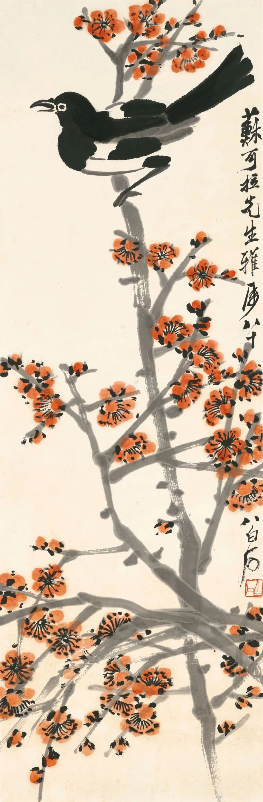 估价:港元 1,200,000 - 1,800,000伦敦佳士得,中国十九二十世纪绘画(II),1998年6月15日,编号197;香港苏富比,中国书画拍卖,2018年10月2日,编号1293《寄萍堂画录》,吉林美术出版社,2000年12月,图版192旧藏家苏可拉(Y.K. SHUKLA),1907年生于印度,于孟买习美术,1934年赴意大利进修,入罗马皇家艺术学院习版画,以优异成绩毕业,遂返国从事教育工作。1947年,考获印度政府奖学金,赴中国研习美术,以促进中印两国文化交流。他在1947年抵北平,先习中文,再转入国立北平艺术专科学校,师事徐悲鸿、王青芳。翌年六月毕业,先后在北京大学和南京中央大学举行画展。苏可拉仰慕中国艺术,北平艺专求学期间,他结识多位中国艺术家,饱览私人收藏,并与收藏家和艺术家一起讨论,从而与齐白石、徐悲鸿等多位二十世纪重要艺术家结为好友。在他们的引导下,苏氏开始收藏,并收藏了一批重要的现代中国画。本幅即齐白石当时所赠之一,并于1998年由苏可拉先生后人委托在伦敦佳士得拍卖。