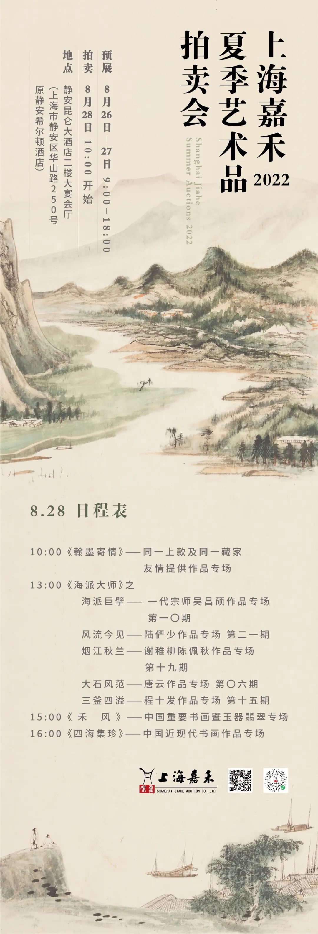 上海嘉禾2022夏拍《四海集珍》专场倾情奉献佳作三百余件,当代书画部分严选韩天衡、韩美林,龙瑞、刘大为、周传玉等画坛能手佳作,承传统之精粹,展时代之新风,邀您领略当代风华,笔底烟云。
