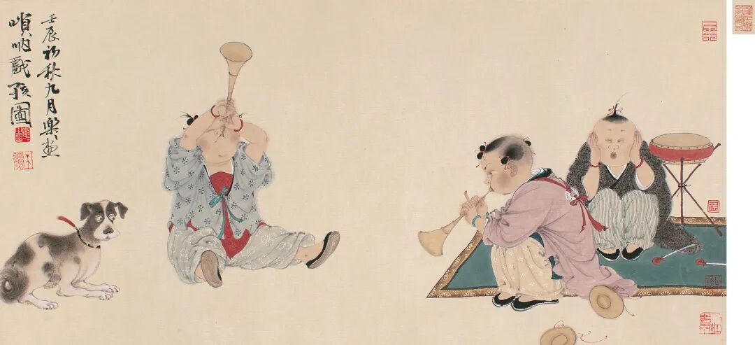 题识:唢呐戏孩图。壬辰初秋九月,乐乐画。