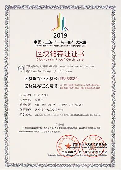 附:2019.中国·上海“一带一路“艺术展区块链存证证书。
