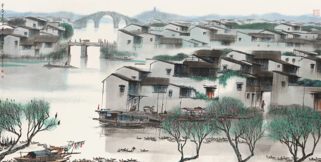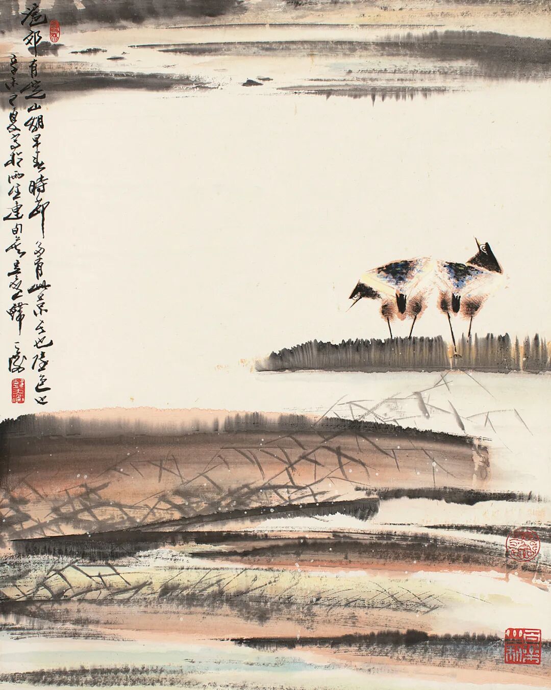 题识:沪郊有淀山湖,早春时节多有此景在也,佳色也。辛未之夏写于雨注连旬候,豆庐韩天衡。