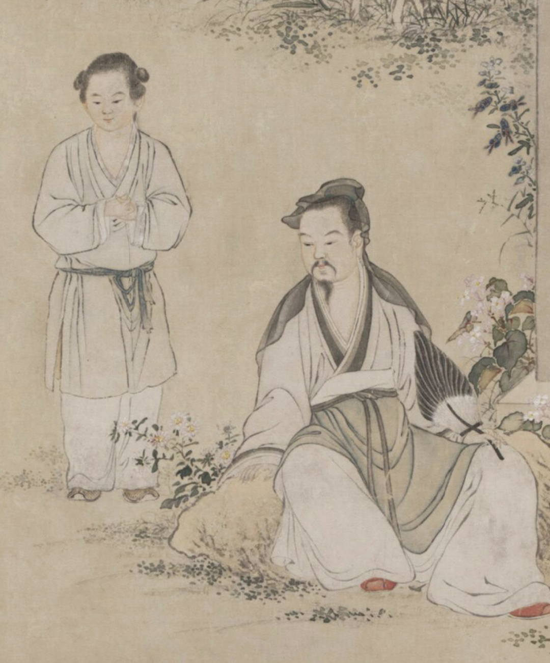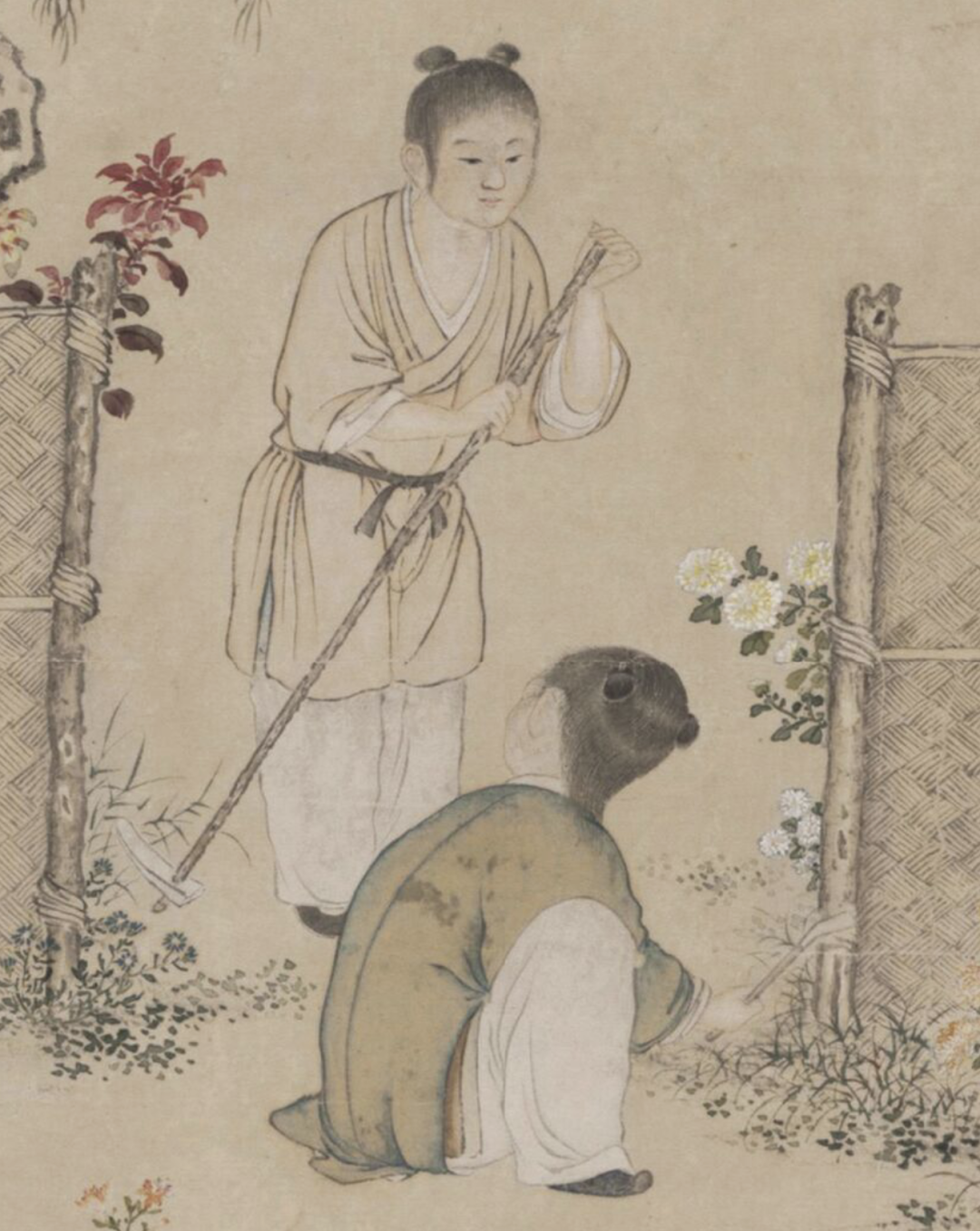 正在回望另一侍琴迈上台阶的半隐文童,