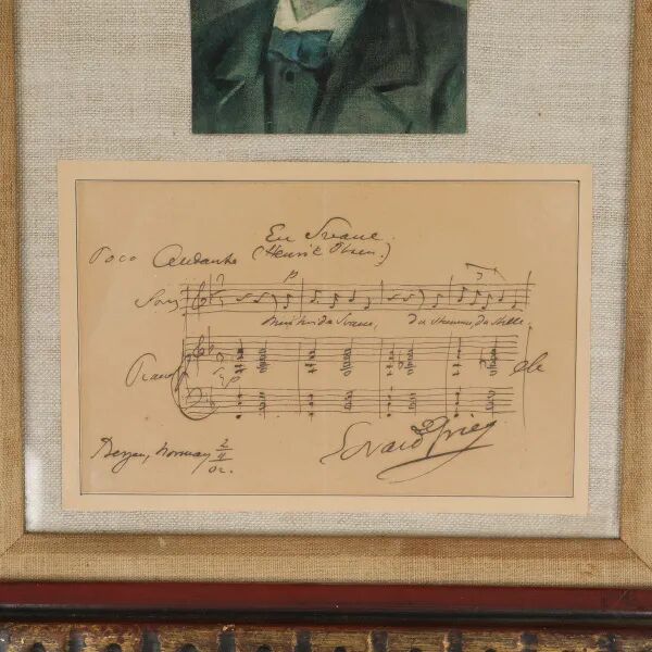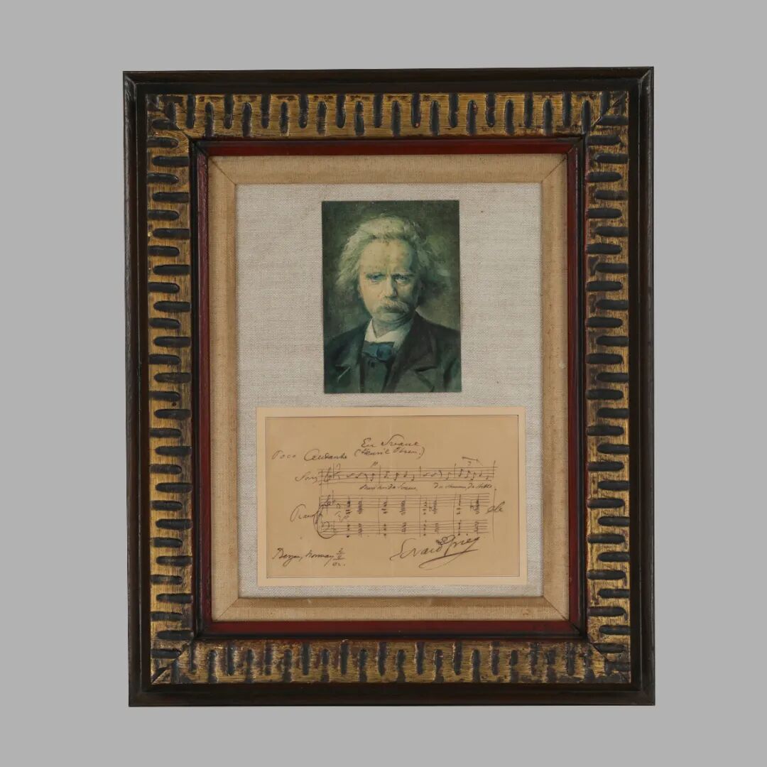 说明:此为爱德华·格里格代表作《天鹅》乐谱引用稿,乐谱下方有格里格签名,并写有“bergen Norway, 1902.11.2”。框背面保留签名集原始标签。