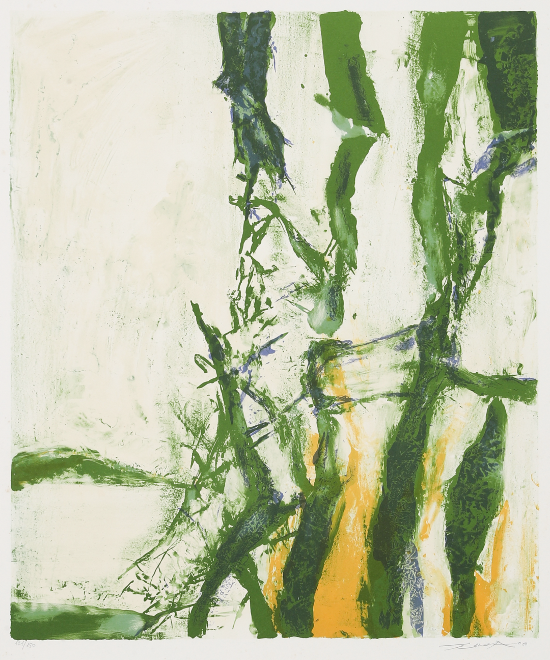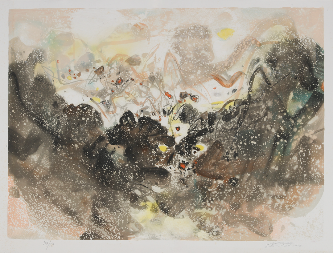 说明:独山居主人珍藏,其为赵无极朱德群原创版画著名代理人,本拍品藏家得自艺术家本人。本作是赵无极系列版画《春夏秋冬》之《夏》,此套版画展示了赵无极在驾驭版画语言上的强大能力,以及运用色彩表现特定氛围的艺术天赋。作品《夏》中笔触简洁直率,表现了骄阳似火下的绿意迸发。石版上画笔与色彩的自由挥洒流动,使作品保持了非常强的绘画性。画家直率地表现着精神和情感,在行云流水的优美节奏中,蕴含着对意象世界的理解。其表现自然情致与精神境界的高超技法已表现的炉火纯青,已入化境。