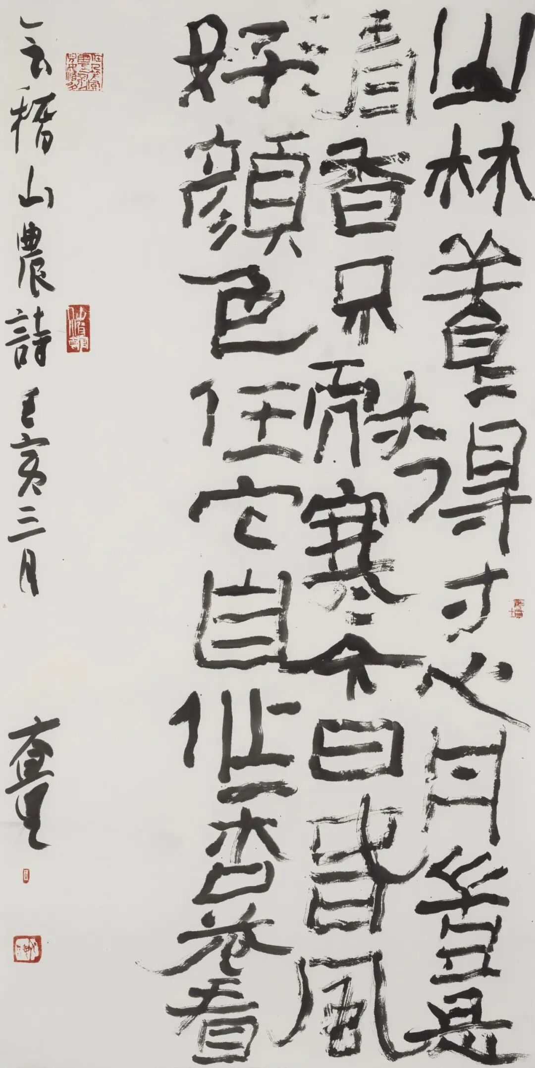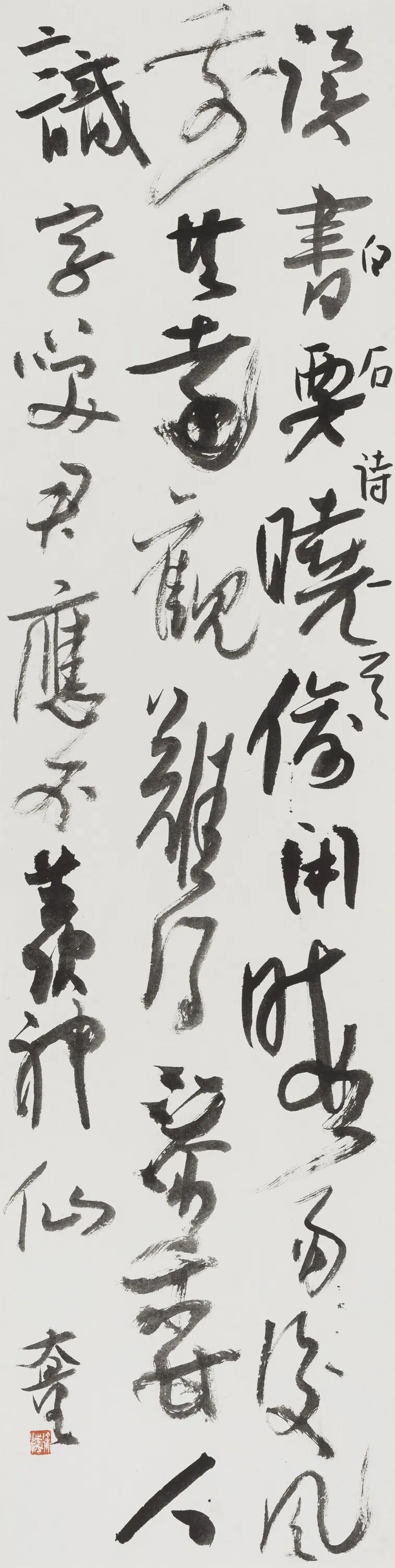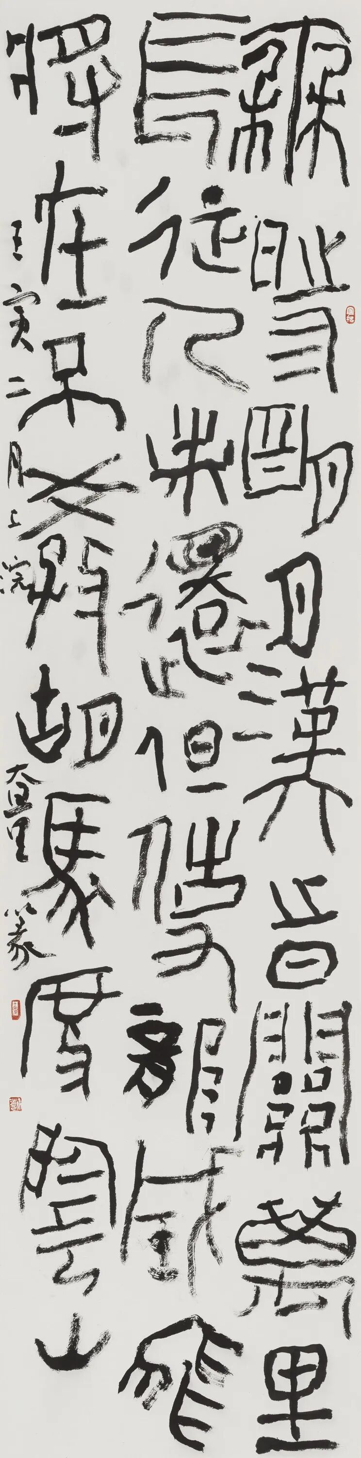 徐海书法的风格分期给我的感觉是不太明显。从二十世纪八九十年代到今天,他始终都保持一种“前卫”的状态,这个“前卫”是指一种“不乖时”的祈尚,这对于一位书法家是极不寻常的。在传统中去讨生活,在经典里去寻新意,一般而言,在几十年的笔耕不辍里,人的个性已被“传统”打磨成了“温文尔雅”,剩下的仅仅是古人华丽的外衣和腔调。不由衷、少天然,正是笔墨中的“优孟衣冠”。在此一点,可以说徐海是任性的、是坚定不移地沿着自己路线前行的人。而他的书写,不仅仅是从传统的经典碑帖中来、更多的是从篆刻中来、从刀在石上的冲切而来、从他从小养成的精益的细节中来,当然,这一切都是从他的人生个性与心灵的品质中来。